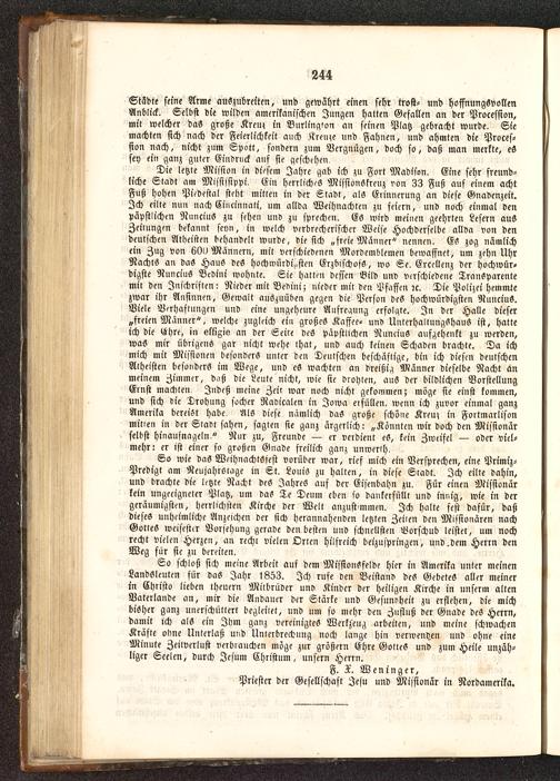 So schloß sich meine Arbeit auf dem MissionSfelde hier in Amerika unter meinenLandsleuten für daS Jahr l853. Ich rufe den Beistand des Gebetes aller meinerin Christo lieben theuern Milbrüder unv Kinder der heiligen Kirche in unserm altenNaterlande an, mir die Andaner der Stärke und Gesundheit zu erflehen, die michbisher ganz unerschüttert begleitet, und um so mehr den Zufluß der Gnade des Herrn,damit ich als ein Ihm ganz vereinigtes Werkzeug arbeiten, und meine schwachenKräfte obne Unterlaß und Unterbrechung noch lange hin verwenden und ohne eineMinute Zeilverlust verbrauchen möge zur größern Ehre Gottes und zum Heile unzäh-liger Seelen, durch Jesum Christum, unsern Herrn.