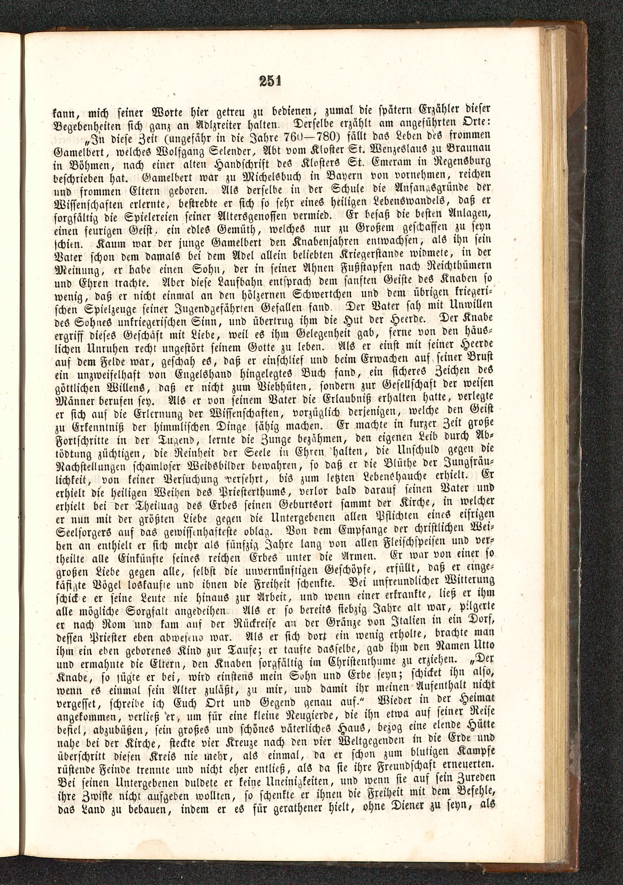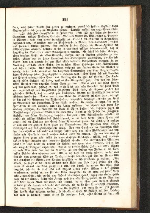 kann, mich seiner Worte hier getreu zu bedienen, zumal die spätern Erzähler dieserBegebenheiten sich ganz an Adlzreiter halten. Derselbe erzählt am angeführten Orte:„In diese Zeit (ungefähr in die Jahre 760—780) fällt das Leben dcS frommenGamelbert, welches Wolfgang Seiender, Abt vom Kloster St. WenzeölanS zu Branuauin Böhmen, nach einer alten Handschrift des KlvsterS St. Emeram in RegenSburg beschrieben hat. Gamelbert war zu MichclSbuch in Bayern von vornehmen, reichenund frommen Eltern geboren. Als derselbe in der Schule die Ansan^Sgründe derWissenschaften erlernte, bestrebte er sich so sehr eines heiligen Lebenswandeis, daß ersorgfällig die Spielereien seiner Altersgenossen vermied. Er besaß die besten Anlagen,einen feurigen Geist, ein edlcS Gemüth, welches nur zu Großem geschaffen zu seynfchien. Kaum war der junge Gamelbert den Knabenjahrcn einwachsen, als ihn seinVater schon dem damals bei dem Adel allein beliebten Kriegerstanste widmete, in derMeinung, er babe einen Sohn, der in seiner Ahnen Fußstapfen nach Reichthümernund Ehren trachte. Aber diese Laufbahn entsprach dem sausten Geiste des Knaben sowenig, daß er nicht einmal an den hölzernen Schwcrtchen und dem übrigen kriegeri-schen Spielzeuge seiner Jugendgefährten Gefallen fand. Der Vater sah mit Unwillendeö SohneS unkriegerischen Sinn, und übertrug ihm die Hut der Hecrde. Der Knabeergriff dieses Geschäft mit Liebe, weil es ihm Gelegenheit gab, ferne von den häus-lichen Unruhen recht ungestört seinem Gotte zu leben. Als er einst mit seiner Heerveauf dem Felde war, geschah eS, daß er einschlief und beim Erwachen auf seiner Brustein unzweifelhaft von Engelshand hingelegtes Buch fand, ein sicheres Zeichen deSgöttlichen Willens, daß er nicht zum Viehhüten, sondern zur Gesellschaft der weisenMännerberufen sey. Ais er von seinem Vater die Erlaubniß erhalten hatte, verlegteer sich auf die Erlernung der Wissenschaften, vorzüglich derjenigen, welche den Geistzu Erkenntniß der himmlischen Dinge fähig machen. Er machte in kurzer Zeit großeFortschritte in der Tugend, lernte die Zunge bezähmen, den eigenen Leib durch Ab-tödtung züchtigen, die Reinheit der Seele in Ehren halten, die Unschuld gegen dieNachstellungen schamloser Weibsbilder bewahren, so daß er die Blüthe der Jungfräu-lichkeit, von keiner Versuchung vcrsehrt, bis zum letzten Leben«?hauche erhielt. Ererhielt die heiligen Weihen des PriestcrthumS, verlor bald darauf seinen Vater underhielt bei der Theilung des ErbeS seinen Geburtsort sammt der Kirche, in welcherer nun mit der größten Liebe gegen die Untergebenen allen Pflichten eincS eifrigenSeelsorgers ans das gewisstnhasteste oblag. Von dem Empfange der christlichen Wei-den an enthielt er sich mehr als fünfzig Jahre lang von allen Fleischspeisen und ver-theilte alle Einkünfte seines reichen ErbeS unter die Armen. Er war von einer sogroßen Liebe gegen alle, selbst die unvernünftigen Geschöpfe, erfüllt, daß er einge-rastete Vögel loSkanfle und ihnen die Freiheit schenkte. Bei unfreundlicher Witterungschick e er seine Leute nie hinanS zur Arbeit, und wenn einer erkrankte, ließ er ihmalle mögliche Sorgfalt angedeihen Als er so bereits siebzig Jahre all war, pilgerteer nach Rom und kam auf der Rückreise an der Gränze von Italien in ein Dorf,dessen Priester eben abwestno war. Als er sich dort ein wenig erholte, brachte manihm ein eben geborenes Kind zur Taufe; er taufte dasselbe, gab ihm den Namen Uttound ermähnte die Eltern, den Knaben sorgfältig im Christenchume zn erziehen. „DerKnabe, so >ügte er bei, wird einstens mein Sohn und Erbe seyn; schicket ihn also,wenn es einmal sein Alter zuläßt, zu mir, uud damit ihr meinen Aufenthalt nichtvergesset, schreibe ich Euch Ort und Gegend genau auf." Wieder in der Heimalangekommen, verließ er, um für eine kleine Neugierde, die ihn etwa auf seiner Reisebefiel, abzubüßen, sein großes und schönes väterliches HauS, bezog eine elende Hüttenahe bei der Kirche, steckte vier Kreuze nach den vier Weltgcgeudcn iu die Erde undüberschritt diesen Kreis nie mehr, als einmal, da er schon zum bluligen Kampferüstende Feinde trennte und nicht eher entließ, als da sie ihre Freundschaft erneuerten.Bei seinen Untergebenen duldete er keine Uneinigkeiten, und wenn sie auf sein Zuredenihre Zwiste nicht aufgeben wollten, so schenkte "er ihnen die Freiheit mit dem Befehle,das Land zu bebauen, indem er es für gerathener hielt, ohne Diener zu seyn, als
