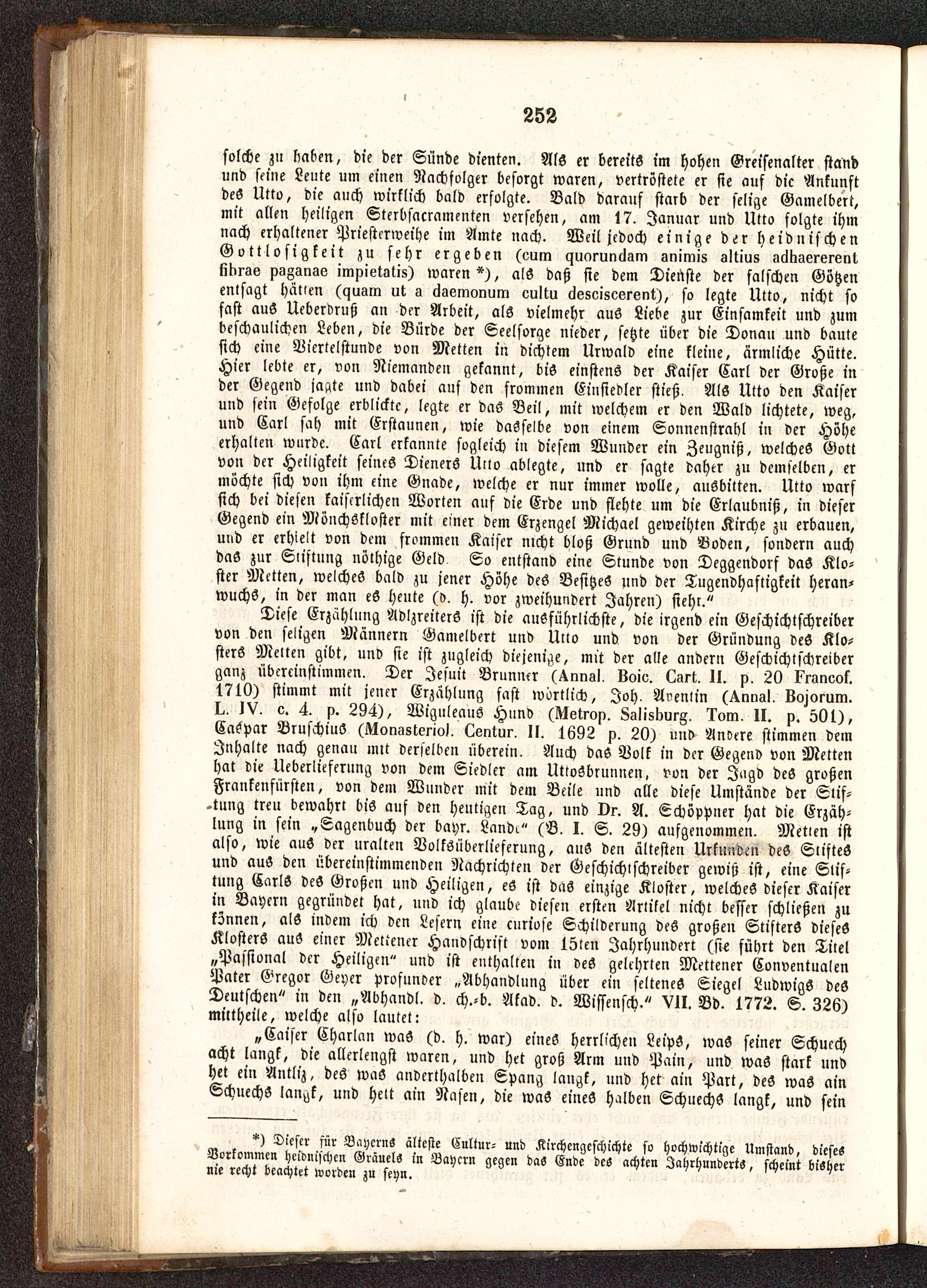 solche zu haben, die der Sünde dienten. Als er bereits im hohen Greisenalter standund seine Leute um einen Nachfolger besorgt waren, vertröstete er sie auf die Ankunftdes Utto , die auch wirklich bald erfolgte. Bald darauf starb der selige Gamelbert,mit allen heiligen Sterbsacramenten versehen, am 17. Januar und Utto folgte ihmnach erhaltener Priestcrweihe im Amte nach. Weil jedoch einige der heidnischenGottlosigkeit zu sehr ergeben (vum c>uc,runclam snimis sltius »clnaererent.likrss pagans«; impietatis) waren *), als daß sie dem Dienste der falschen Götzenentsagt hallen (quam ut a clgemonum cultu clesciscerent), so legte Utto, nicht sofast auS Uebervruß an der Arbeit, als vielmehr aus Liebe zur Einsamkeit und zumbeschaulichen Leben, die Bürde der Seclsorge nieder, setzte über die Donan und bautesich eine Biertelstunde von Metten in dichtem Urwald eine kleine, ärmliche Hütte.Hier lebte er, von Niemanden gekannt, bis einstens der Kaiser Carl der Große inder Gegend ja^te und dabei auf den frommen Einsiedler stieß. Als Utto den Kaiserund sein Gefolge erblickte, legte er das Beil, mit welchem er den Wald lichtete, weg,und Carl sah mit Erstaunen, wie dasselbe von einem Sonnenstrahl in der Höheerhallen wurde. Carl erkannte sogleich in diesem Wunder ein Zeugniß, welches Gottvon der Heiligkeit seines Dieners Utto ablegte, und er sagte daher zu demselben, ermöchte sich von ihm eine Guade, welche er nur immer wolle, auSbitten. Utto warfsich bei diesen kaiserlichen Worten auf die Erde und flehte um die Erlaubniß, in dieserGegend ein Mönchskloster mit einer dem Erzengel Michael geweihten Kirche zu erbauen,und er erhielt von dem frommen Kaiser nicht bloß Grund und Boden, sondern auchdas zur Stiftung nöthige Geld So entstand eine Stunde von Deggendorf daS Klo-ster Metten , welches bald zu jener Höhe des Besitzes und der Tugendhaftigkeit heran-wuchs, in der man eS heute (d, h. vor zweihundert Jahren) sieht."
