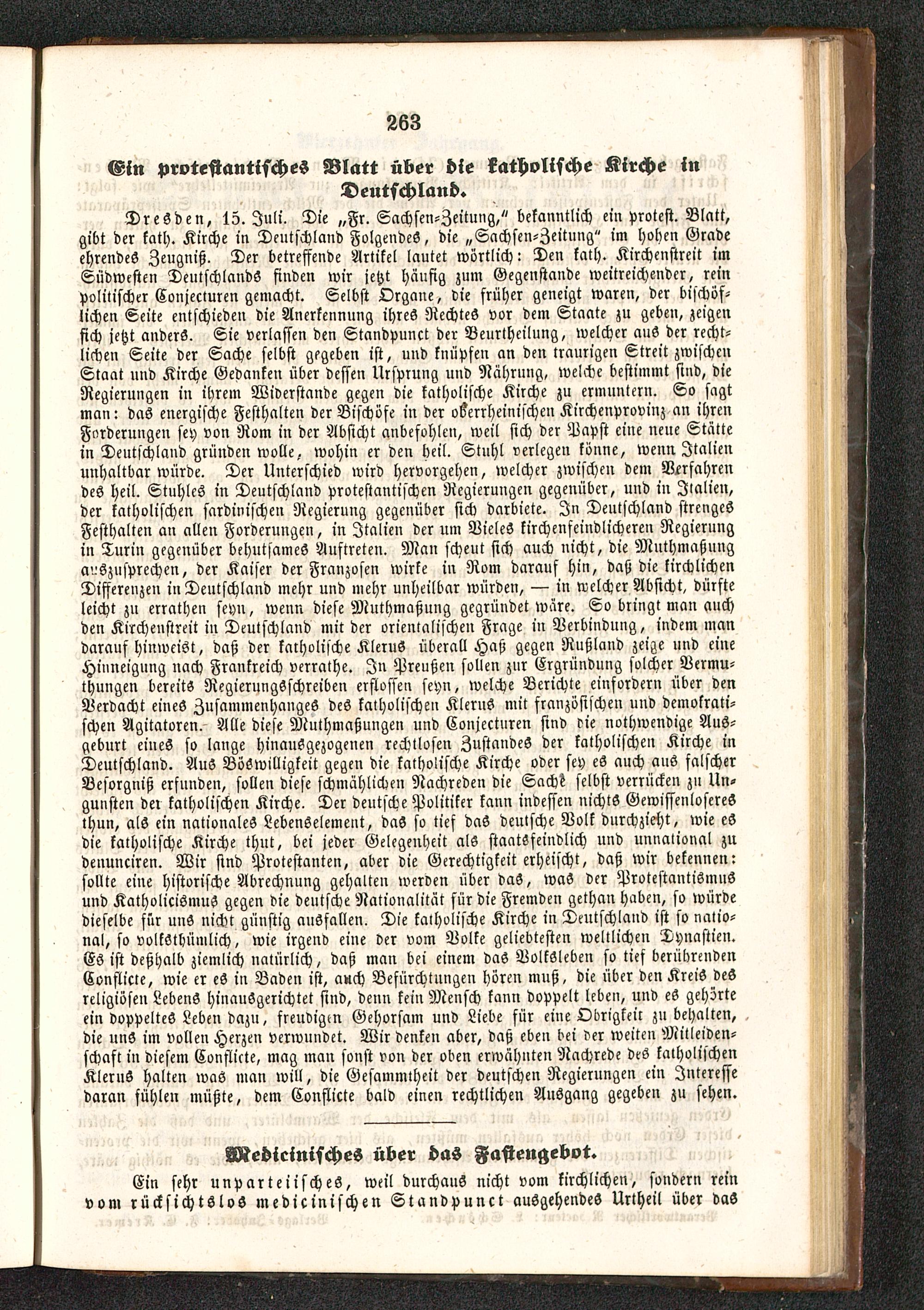 Dresden , 15. Juli. Die „Fr. Sachsen-Zeitung," bekanntlich ein Protest. Blatt,gibt der kath. Kirche in Deutschland Folgendes, die „Sachsen-Zeitung" im hohen Gradeehrendes Zeugniß. Der betreffende Artikel lautet wörtlich: Den kath. Kirchenstreit imSüdwcsten Deutschlands finden wir jetzt häufig zum Gegenstände weitreichender, reinpolitischer Conjecturen gemacht. Selbst Organe, die früher geneigt waren, der bischöf-lichen Seite entschieden die Anerkennung ihres Rechtes vor dem Staate zu gebe», zeigensich jetzt anders. Sie verlassen den Standpunct der Beurtheilung, welcher aus der recht-lichen Seite der Sache selbst gegeben ist, und knüpfen an den traurigen Streit zwischenStaat und Kirche Gedanken über dessen Ursprung und Nährung, welche bestimmt sind, dieRegierungen in ihrem Widerstande gegen die katholische Kirche zu ermuntern. So sagtman: das energische Festhalten der Bischöfe in der oberrheinischen Kirchenprovinz an ihrenForderungen sey von Rom in der Absicht anbefohlen, weil sich der Papst eine neue Stättein Deutschland gründen wolle, wohin er den heil. Stuhl verlegen könne, wenn Italien unhaltbar würde. Der Unterschied wird hervorgehen, welcher zwischen dem Verfahrendes heil. Stuhles in Deutschland protestantischen Regierungen gegenüber, und in Jialien,der katholischen sardinischen Regierung gegenüber sich darbiete. In Deutschland strengesFesthalten an allen Forderungen, in Italien der um NieleS kirchenfeindlicheren Regierungin Turin gegenüber behutsames Auftreten. Mau scheut sich auch nicht, die Muthmaßungcn:szusprechen, der Kaiser der Franzosen wirke in Rom darauf hin, daß die kirchlichenDifferenzen in Deutschland mehr und mehr unheilbar würden, — in welcher Absicht, dürsteleicht zn errathen seyn, wenn diese Muthmaßung gegründet wäre. So bringt man auchden Kirchenstreit in Deutschland mit der orientalischen Frage in Verbindung, indem mandarauf hinweist, daß der katholische KleruS überall Haß gegen Rußland zeige und eineHinneigung nach Frankreich verrathe. In Preußen sollen zur Ergründuug solcher Vermu-thungen bereits RegierungSschreiben erflossen seyn, welche Berichte einfordern über denVerdacht eines Zusammenhanges des katholischen Klerus mit französischen und demokrati-schen Agitatoren. Alle diese Muthmaßungen und Conjecturen sind die nothwendige Aus-geburt eiueS so lange hinausgezogenen rechtlosen Zustandes der katholischen Kirche inDeutschland. Aus Böswilligkeit gegen die katholische Kirche oder sey es auch aus falscherBesorgniß ersuudeu, sollen diese schmählichen Nachreden die ScM selbst verrücken zu Un-gunsten der katholischen Kirche . Der deutsche Politiker kann indessen nichts Gewissenloseresthun, als ein nationales Lebenselement, das so tief daS deutsche Volk durchzieht, wie eSdie katholische Kirche thut, bei jeder Gelegenheit als staatsfeindlich und unnalional zudenunciren. Wir sind Protestanten, aber die Gerechtigkeit erheischt, daß wir bekennen:sollte eine historische Abrechnung gehalten werden über daS, waS der Protestantismusund Katholicismus gegen die deutsche Nationalität sür die Fremden gethan haben, so würdedieselbe für uns nicht günstig ausfallen. Die katholische Kirche in Deutschland ist so natio-nal, so volköthümlich, wie irgend eine der vom Volke geliebtestcn weltlichen Dynastien.Es ist deßhalb ziemlich natürlich, daß man bei einem das Volksleben so tief berübrendenConflicte, wie er eS in Baden ist, auch Befürchtungen hören muß, die über den Kreis desreligiösen Lebens hinanSgerichtet sind, denn kein Mensch kann doppelt leben, und eS gehörteein doppeltes Leben dazu, freudigen Gehorsam und Liebe für eine Obrigkeit zu behalten,die uns im vollen Herzen verwundet. Wir denken aber, daß eben bei der weiten Mitleiden-schaft in diesem Conflicte, mag man sonst von der oben erwähnten Nachrede deS katholischen KleruS halten waS man will, die Gesammtheit der deutschen Regierungen ein Interessedaran fühlen müßte, dem Conflicte bald einen rechtlichen Ausgang gegebeu zu sehen.