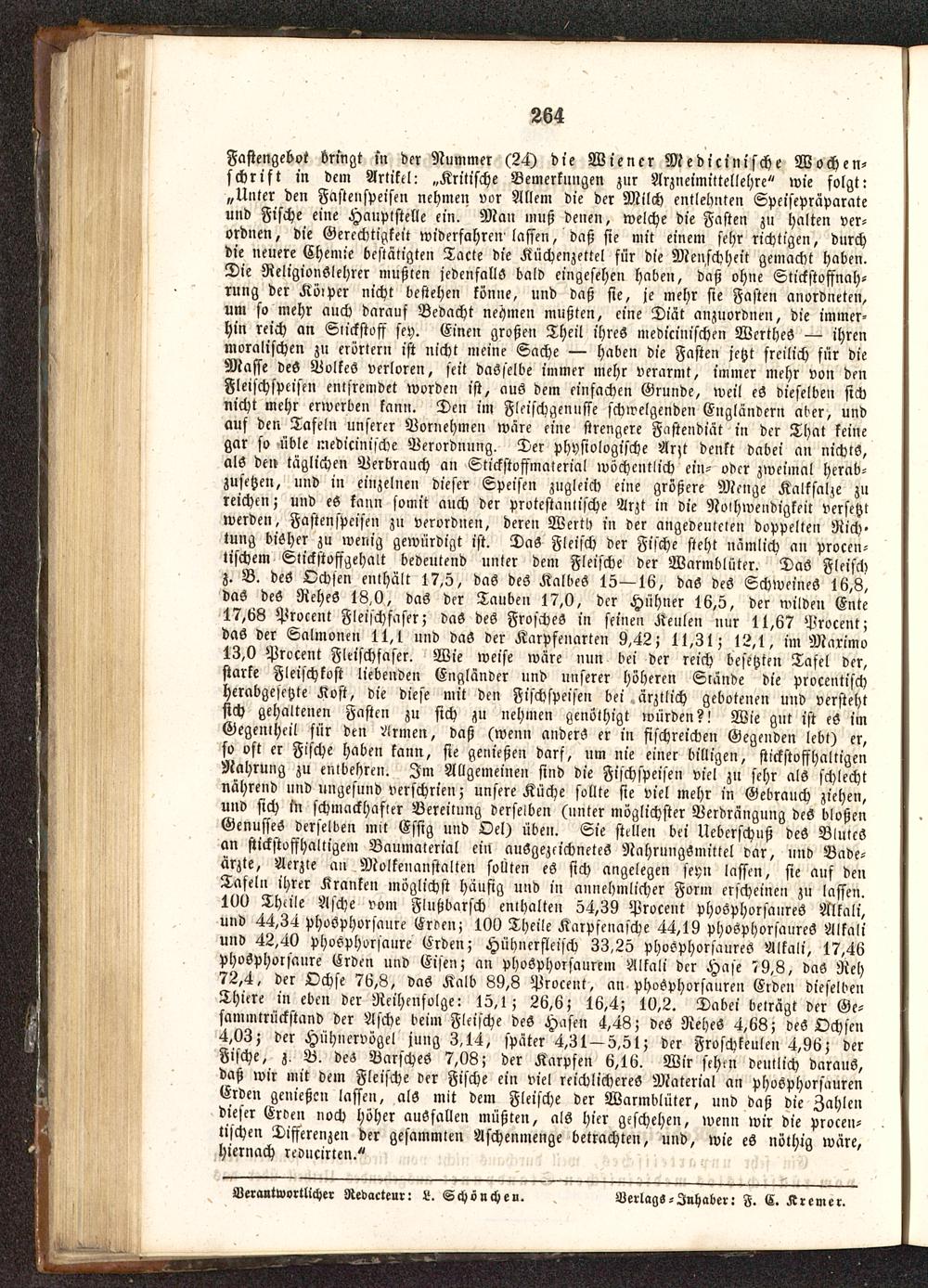 Fastengebot bringt in der Nummer (34) die Wiener Medicinische Wochen-schrift in dem Artikel: „Kritische Bemerkungen zur Arzneimittellehre" wie folgt:„Unter den Fastenspeisen nehmen vor Allem die der Milch entlehnten Speisepräparateund Fische eine Hcmplstelle ein. Man muß denen, welche die Fasten zu halten ver-ordnen, die Gerechtigkeit widerfahren lassen, daß sie mit einem sehr richtigen, durchdie neuere Chemie bestätigten Tacte die Kuchenzettel für die Menschheit gemacht haben.Die ReligionSlehrcr mußten jedenfalls bald eingesehen haben, daß ohne Stickstoffnah-rung der Köipcr nicht bestehen könne, und daß sie, je mehr sie Fasten anordneten,um so mehr auch darauf Bedacht nehmen mußten, eine Diät anzuordnen, die immer-hin reich an Stickstoff sey. Einen großen Theil ihres medicinischen Werthes — ihrenmoralischen zn erörtern ist nicht lueine Sache — haben die Fasten jetzt freilich für dieMasse des Volkes verloren, seit dasselbe immer mehr verarmt, immer mehr von denFleischspeisen entsremdet worden ist, aus dem einfachen Grunde, weil cS dieselben sichnicht mehr erwerben kann. Den im Fleischgenusse schwelgenden Engländern aber, undauf den Tafeln unserer Vornehmen wäre eine strengere Feistendiät in der That keinegar so üble medicinische Verordnung. Der physiologische Är;t denkt dabei an nichts,als den täglichen Verbrauch an Stickstoffmalerial wöchentlich ein- oder zweimal herab-zusetzen, und in einzelnen dieser Speisen zugleich eine größere Menge Kalksalze znreichen; und eS kann somit auch der protestantische Arzt in die Noihwendigkeil versetztwerden, Fastenspeisen zu verordnen, deren Werth in der angedeuteten doppelten Rich-tung bisher zu wenig gewürdigt ist. DaS Fleisch der Fische steht nämlich an proccn-tischem Stickstoffgehait bedeutend unter dem Fleische der Warmblüter. DaS Fleischz. B. des Ochsen enthält 17,5, das des KalbeS 15—16, das deS Schweines 16,8,das deS ReheS 18,0, das der Tauben 17,0, der Hühner 16,5, der wilden Ente17,68 Procent Fleischfaser; daS des Frosches in seinen Keulen nur 11,67 Procent;das der Salmonen 11,l und das der Karpfenarten 9,42; 11,31; 12,1, im Marimo13,0 Procent Fleischfaser. Wie weise wäre nnn bei der reich besetzten Tafel der,starke Fleischkost liebenden Engländer und unserer höheren Stände die procentischherabgesetzte Kost, die diese mit den Fischspeisen bei . ärztlich gebotenen und verstehtsich gehaltenen Fasten zu sich zu nehmen genöthigt würden?! Wie gut ist eS imGegentheil für den Armen, daß (wenn anders er in fischreichen Gegenden lebt) er,so oft er Fische haben kann, sie genießen darf, nm nie einer billigen, stickstoffhaltigenNahrung zu entbehren. Im Allgemeinen sind die Fischspeisen viel zu sehr als schlechtnährend und ungesund verschrien; unsere Küche sollte sie viel mehr in Gebrauch ziehen,und sich in schmackhafter Bereitung derselben (unter möglichster Verdrängung deS bloßenGenusses derselben mit Essig und Oel ) üben. Sie stellen bei Ueberschuß deS BlutcSan stickstoffhaltigem Baumaterial ein ausgezeichnetes Nahrungsmittel dar, und Bade-ärzte, Aerzte an Molkenanstalten sollten eö sich angelegen seyn lassen, sie auf denTafeln ihrer Kranken möglichst häufig und in annehmlicher Form erscheinen zn lassen.100 Theile Asche vom Flußbarsch enthalten 54,39 Procent phosphorsaures Alkali,und 44,34 phoSphorsanre (5rden; 100 Theile Karpsenasche 44,19 phosphorsaures Alkaliund 42,40 PhoSphorsanre Erden; Hühnerfleisch 33,25 phosphorsanres Alkali, 17,46PhoSphorsanre «Lrdeu und Eisen; an phosphorsaurem Alkali der Hase 79,8, das Reh72,4, der Ochse 76,8, das Kalb 89,8 Procent, an phosphorsauren Erden dieselbenThiere in eben der Reihenfolge: 15,l; 26,6; 16,4; 10,2. Dabei beträgt der Gc-sammtrückstand der Asche beim Fleische deS Hasen 4,48; deS ReheS 4,68; deS Ochsen4,03; der Hühnervögel jung 3,14, später 4,31—5,51; der Froschkeulen 4,96; derFische, z, B. des Barsches 7,08; der Karpfen 6,16. Wir sehen deutlich daraus,daß wir mit dem Fleische der Fische ein viel reichlicheres Material an phoöphvrsaurenErden genießen lassen, als mit dem Fleische der Warmblüter, und daß die Zahlendieser Erden noch höher ausfallen müßten, als hier geschehen, wenn wir die procen-tischen Differenzen der gesammlen Aschenmenge betrachten, und, wie es nöthig wäre,hiernach reoucirlen."