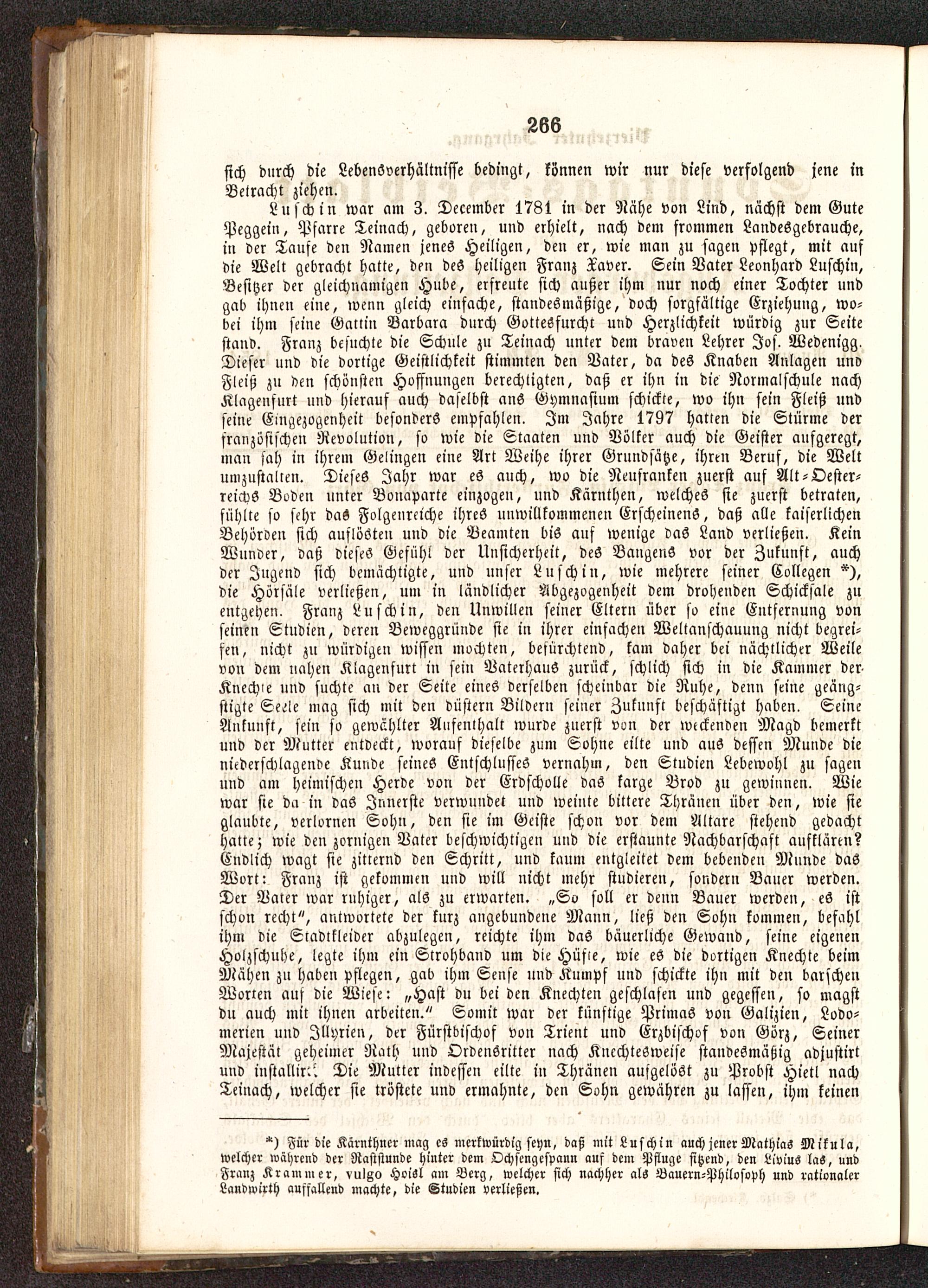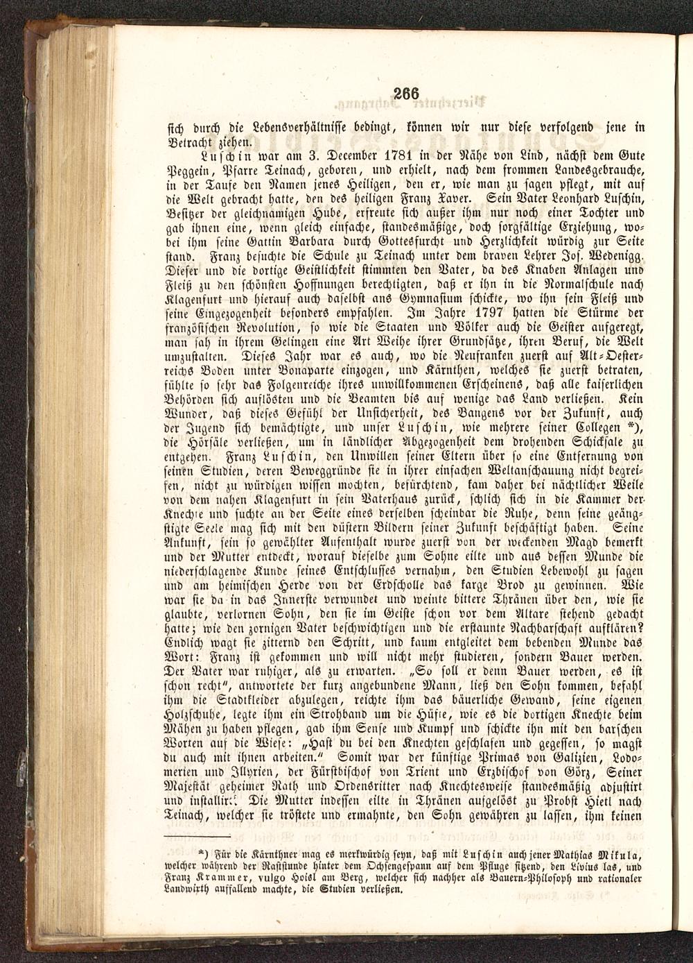 Für die Kärnthncr mag es merkwürdig seyn, daß mit Luschin auch jener Mathias Mikula,welcher während der Raststunde hinter dem Ochsengespann auf dem Pfluge sitzend, den Livius las, undFranz Krammer, vulZo HoiSl am Berg, welcher sich nachher als Bauern-Philosoph und rationalerLandwirth auffallend machte, die Studien verließen.