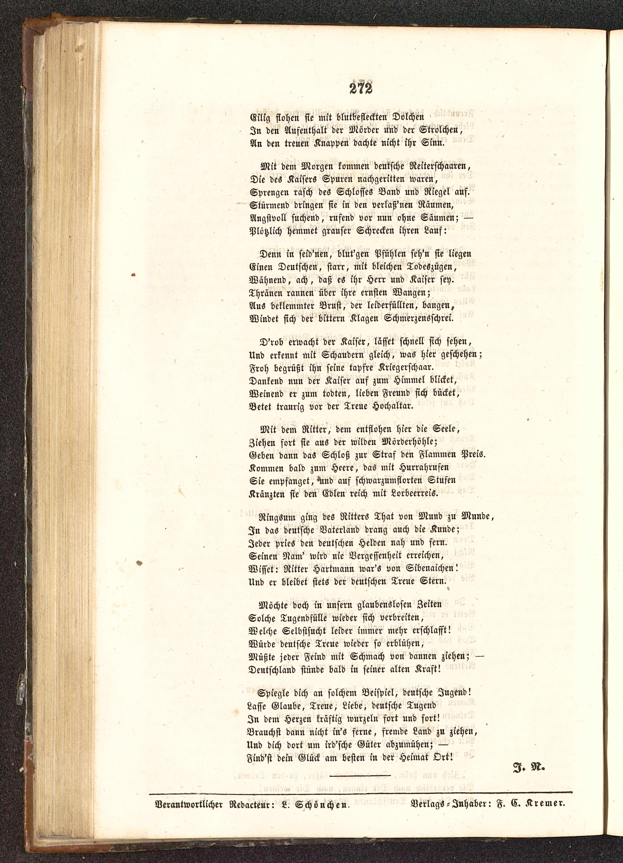 Spiegle dich an solchem Beispiel, deutsche Jugend!Lasse Glaube, Treue, Liebe, deutsche TugendIn dem Herzen kräftig wurzeln fort und fort!Brauchst dann nicht in's ferne, fremde Land zu ziehen,Und dich dort um irdische Güter abzumühen; —Find'st dein Glück am besten in der Heimat Ort!