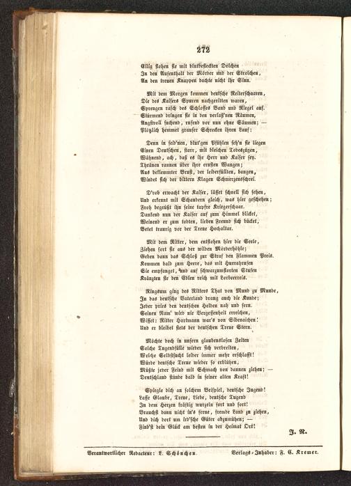 Mit dem Morgen kommen deutsche Reiterschaaren,Die des Kaisers Spuren nachgeritten waren,Sprengen rasch des Schlosses Band und Riegel auf.Stürmend dringen fie in den verlaß'nen Räumen,Angstvoll suchend, rufend vor nun ohne Säumen; —Plötzlich hemmet grauser Schrecken ihren Lauf: