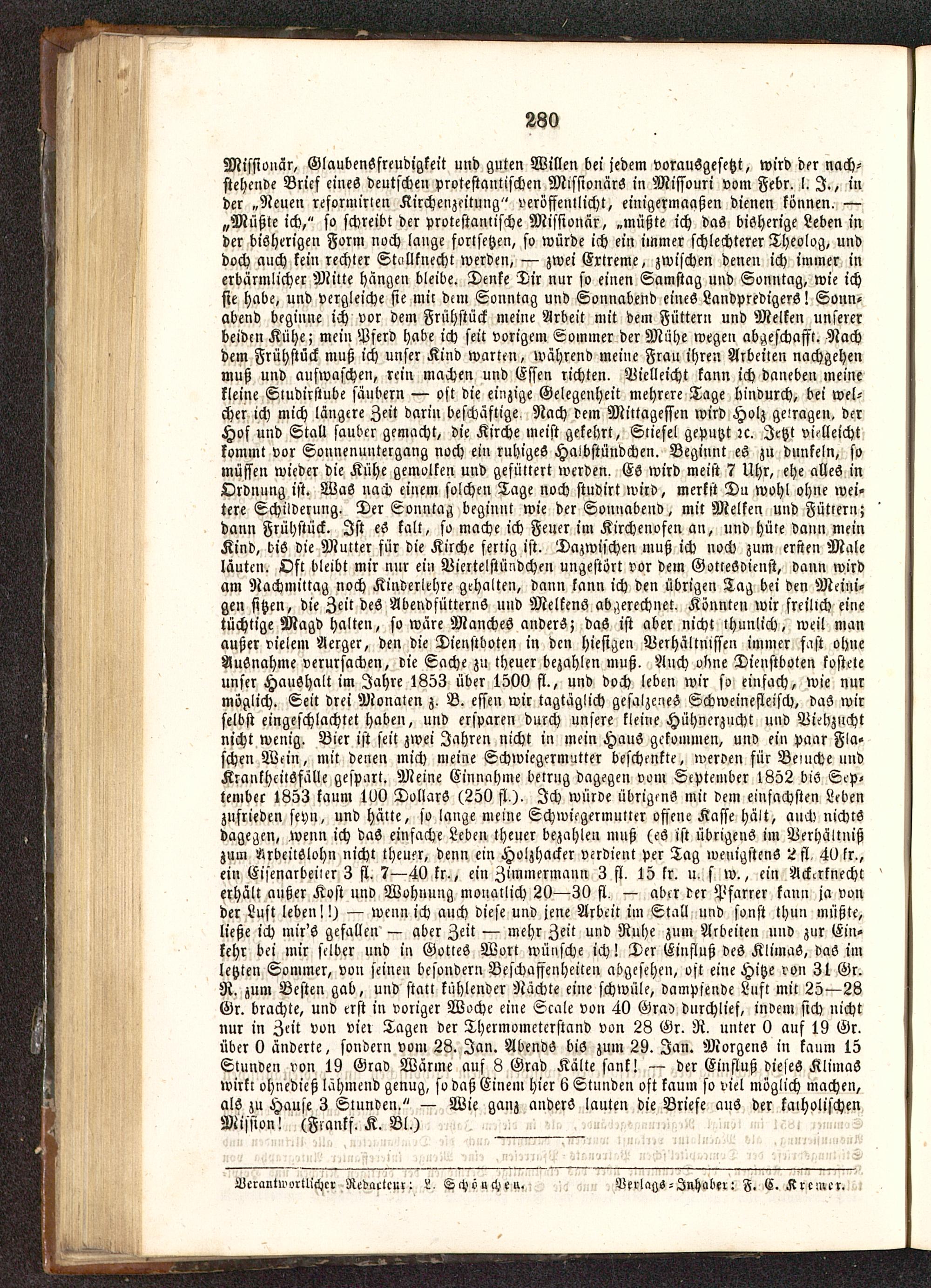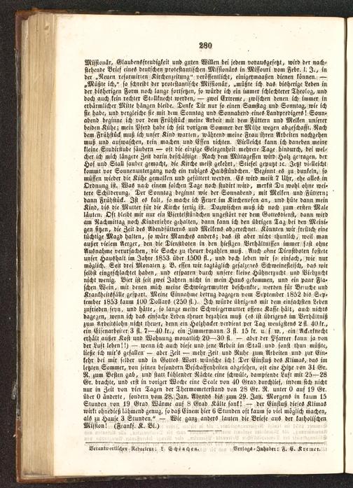 Missionar, GlaubenSfreudigkeit und guten Willen bei jedem vorausgesetzt, wird der nach-stehende Brief eines deutschen protestantischen Missionärs in Missouri vom Febr. l, I., inder „Neuen reformirien Kirchenzeituug" veröffentlicht, einigermaaßen dienen können. —„Müßteich," so schreibt der prolestanlische Missionär, „müßte ich das bisherige Leben inder bisherigen Form noch lauge fortsetzen, so würde ich ein immer schlechterer Theolog, unddoch auch kein rechter Stollknecht werden, — zwei Ertreme, zwischen denen ich immer inerbärmlicher Mitte hängen bleibe. Denke Dir nur so einen Samstag und Sonntag, wie ichsie habe, und vergleiche sie mir dun Sonntag und Sonnabend eines Landpredigers! Sonn-abend beginne ich vor dem Frühstück meine Arbeit mit dem Füttern und Melken unsererbeiden Kühe; mein Pferd habe ich seit vorigem Sommer der Mühe wegen abgeschafft. Nachdem Frühstück muß ich unser Kind warten, während meine Frau ihren Arbeiten nachgehenmuß und auswaschen, rein machen und Essen richten. Vielleicht kann ich daneben meinekleine Sludirslube säubern — oft die einzige Gelegenheit mehrere Tage hindurch, bei wel-cher ich mich längere Zeit darin beschäftige. Nach dem Mittagessen wird Holz gc-ragen. derHof und Stall sauber gemacht, die Kirche meist gekehrt, Stiefel geputzt zc. Jetzt vielleichtkommt vor Sonnenuntergang noch ein ruhiges Haibstündchen. Beginnt es zu dunkeln, somüssen wieder die Kühe gemolken und gefüttert werden. Es wird meist 7 Uhr, ehe alles inOrdnung ist. Was nach einem solchen Tage noch studirt wird, merkst Du wohl ohne wei-tere Schilderung. Der Sonntag beginnt wie der Sonnabend, mit Melken und Füttern;dann Frühstück. Ist eS kalt, so mache ich Feuer im Kirchenofen an, und hüte dann meinKind, bis die Mutter für die Kirche fertig ist. Dazwischen muß ich noch zum ersten Maleläuten. Oft bleibt mir nur ein Viertelstündchen ungestört vor dem Gottesdienst, dann wirdam Nachmittag noch Kinderlehre gehalten, dann kann ich den übrigen Tag bei den Meiui-gen sitzen, die Zeit des AbcndfüttcrnS uud Melkens abgerechnet. Könnten wir freilich einetüchtige Magd halten, so wäre Manches anders; daS ist aber nicht ihuulich, weil manaußer vielem Aerger, den die Dienstboten in den hiesigen Verhältnissen immer f.ist ohneAusnahme verursachen, die Sache zu theuer bezahlen muß. Auch olwe Dienstboten kosteteunser Haushalt im Jahre 1853 über 1500 fl., und doch leben wir so einfach, wie nurmöglich. Seit drei Monaten z. B. essen wir tagtäglich gesalzenes Schweinefleisch, das wirselbst eingeschlachtet haben, und ersparen durch unsere kleine Hühnerzucht und Viehzuchtnicht wenig. Bier ist seit zwei Jahren nicht in mein Haus gekommen, und ein paar Fla-schen Wein, mit denen mich meine Schwiegermutter beschenkte, werden für Beiuche uudKrankheitsfälle gespart. Meine Einnahme betrug dagegen vom September l852 bis Sep-tember 1853 kaum 100 Dollars (250 fl ). Ich würde übrigens mit dem einfachsten Lebenzufrieden seyn, und hätte, so lange meine Schwiegermutter offene Kasse hält, auch nichtsdagegen, wenn ich daS einfache Leben theuer bezahlen muß (es ist übrigens im Verhältnißzum Arbeitslohn nicht theuer, denn ein Holzhacker verdient per Tag wenigstens 2fl. 40 lr.,ein Eiscnarbeiier 3 fl. 7—40 kr., ein Zimmermann 3 fl. 15 lr. u. s w., ein Ack^rtnechterhält außer Kost und Wohnung monatlich 20—30 fl. — aber der Pfarrer kann ja vonder Lust leben!!) — wenn ich auch diese und jene Arbeit im Stall und sonst thun müßte,ließe ich mir's gefallen — aber Zeit — mehr Zeit und Ruhe zum Arbeiten und zur Ein-kehr bei mir selber und in Gottes Wort wünsche ich! Der Einfluß dcS KlimuS, daS imletzten Sommer, von seinen besondern Beschaffenheiten abgesehen, oft eine Hitze von 31 Gr.R. zum Bcsteu gab, und statt kühlender Nächte eine schwüle, dampfende Luft mit 25—28Gr. brachte, und erst in voriger Woche eine Scale von 40 Gra) durchlief, indem sich nichtnur in Zeit von vier Tagen der Thermometerstand von 28 Gr. R. unter 0 auf 19 Gr.über 0 änderte, sondern vom 28. Jan. Abends bis zum 29. Jan. Morgens in kaum 15Stunden von 19 Grad Wärme auf 8 Grad Kälte sank! — der Einfluß dieses KlimaSwirkt ohnedies) lähmend genug, so daß Einem hier 6 Stunden oft kaum so viel möglich machen,als zu Hause 3 Stunden." — Wie ganz anders lauten die Briefe ans der katholischenMission! (Fmnkf. K. Bl.)