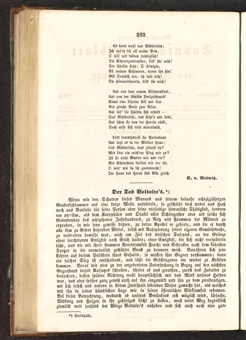 Wenn wir den Schatten dieses ManneS auS seinem beinahe achtzigjährigenGrabesschlummer aus eine' kurze Weile aufrütteln, so geschieht dieß weder auS Haßnoch aus Vorliebe für seine Person oder seine vielseitige literarischc Thätigkeit, sonvernum an-ihm, als dem Koryphäen und Orakel aller Schöngeister oder als solche sichGeberdenden deS achtzehnten Jahrhunderts, zu Nutz und Frommen der Mitwelt zuerproben, in wie fern gewisse Lehren, zu deren Apostel er geHorte, und die er durchalle ihm zu Gebot stehenden Mittel, selbst mit Aufopferung seiner eigenen Gemüthsruhe,zu verbreiten bemüht war, auch am Ziel des irdischen Daseyns, an der Gränzeeiner furchtbaren Ewigkeit noch Stich halten; einer Ewigkeit, die sich nicht verspöttelnläßt, und t>ie mit ihrer stummen Beredtsamkeit Furcht unv Schrecken auch dem kühnstenTrotzer in die vermeintlich gestählte Brust zu donnern weiß. Bewähren sich jeneLehren ans diesem Prüfstein ihres Gehalts, so müssen ihre Gegner verstummen; dennein solcher Sieg ist entscheidend, und läßt die Geschlagenen nie wieder zu Kräftenkommen. Bevor wir aber zu der angedeuteten Untersuchung in Bezug auf ven nächstenGegenstand dieses Aufsatzes schreiten, scheint es uns gerathen, zuerst das Zeitalter zubetrachten, dessen spätere Richtung wohl hauptsächlich mit das Werk unseres Heldenwar, das aber früher ganz gewiß auch auf ihn eingewirkt und ihn zu dem zweideutigen,mit sich selbst und andern in stetem Zwiespalt lebenden Wesen gemacht hat, als welcheswir ihn in seiner häuslichen Lage wie in seiner öffentlichen Wirksamkeit erkennen.Bei dieser Betrachtung, wodurch es unseres Bebünkens erst möglich wird, Ursache,Wirkung und Folgen in ihr gehöriges Licht zu stellen, muß unser Weg begreiflichziemlich weit jenseits der Wiege Voltaire'S anheben und sich auch noch eine gute