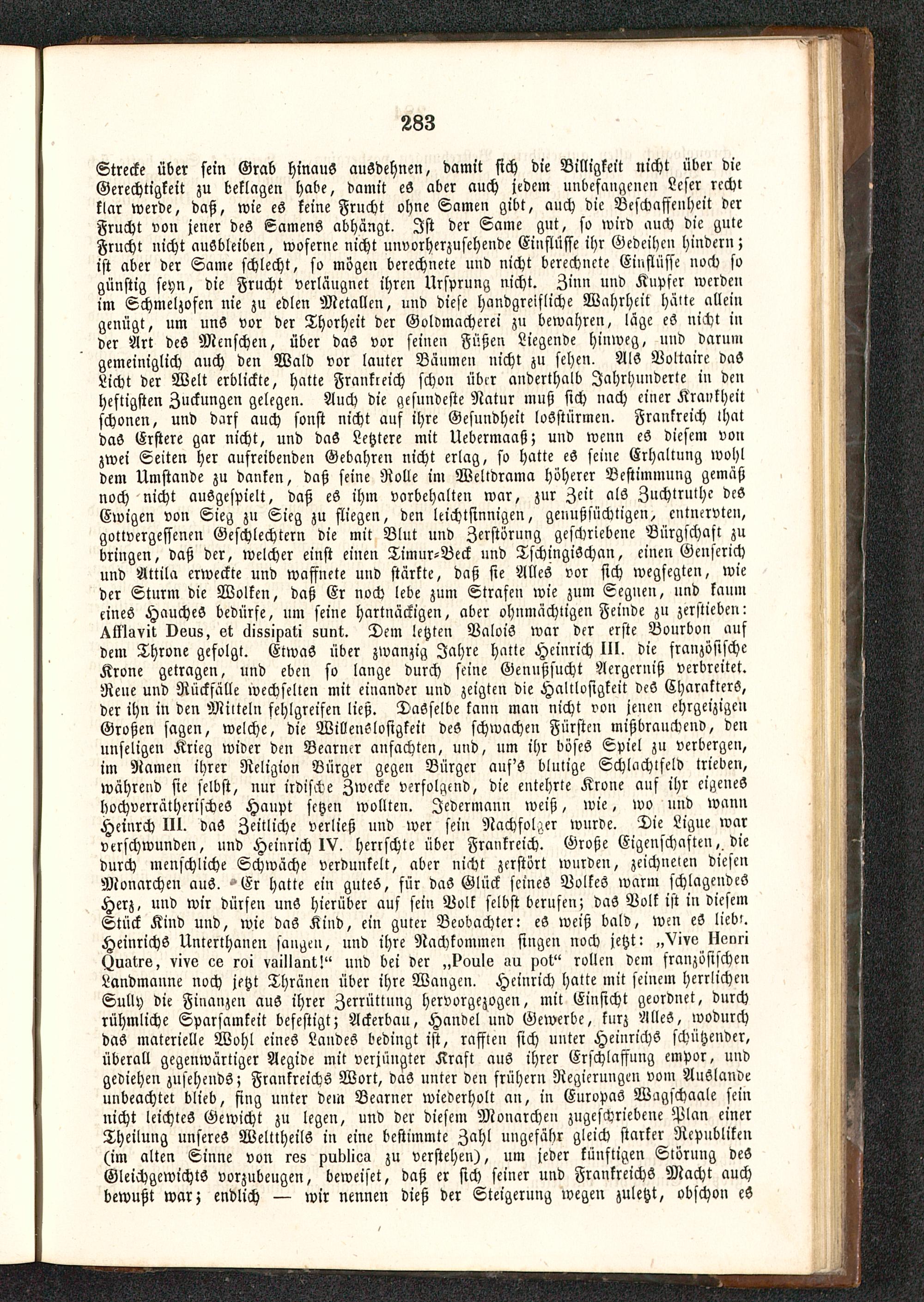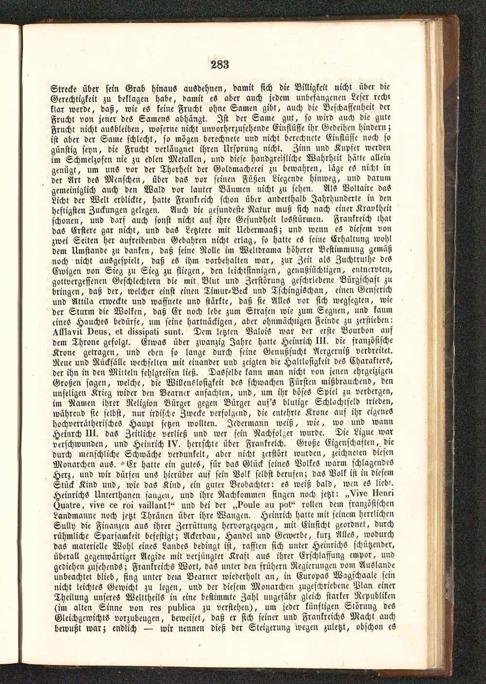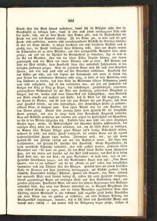 Strecke über sein Grab hinaus ausdehnen, damit sich die Billigkeit nicht über dieGerechtigkeit zu beklagen habe, damit eS aber auch jedem unbefangenen Leser rcchlklar werde, daß, wie es keine Frucht ohne Samen gibt, auch die Beschaffenheit derFrucht von jener des Samens abhängt. Ist der Same gut, so wird auch die guteFrucht nicht ausbleiben, woferne nicht uuvorherzuseheude Einflüsse ihr Gedeihe» hindern;ist aber der Same schlecht, so mögen berechnete nnd nicht berechnete Einflüsse noch sogünstig seyn, die Frucht verläugnet ihren Ursprung nicht. Zinn und Kupfer werde»im Schmelzofen nie zu edlen Metallen, und diese handgreifliche Wahrheit halte alleingenügt, um uns vor der Thorheit der Goldmachern zu bewahre», läge eS nicht inder Art deS Menschen, über das vor seinen Füßen Liegende hinweg, und darumgemeiniglich auch den Wald vor lauter Bäumen nicht zu sehen. AIS Voltaire baSLicht der Welt erblickte, hatte Frankreich schon über anderthalb Jahrhunderte in denheftigsten Zuckungen gelegen. Auch die gcsuudeste Natur muß sich nach einer Krankheitschonen, und darf auch sonst nicht auf ihre Gesundheil losstürmen. Frankreich thatdas Erstere gar nicht, und daS Letztere mit Ucbermaaß; und wenn eS diesem vonzwei Seiten her ausreibenden Gebcchren nicht erlag, so hatte es seine Erhallung wohldem Umstände zu danken, daß seine Rolle im Welldrama höherer Bestimmung gemäßnoch nicht ausgespielt, daß es ihm vorbehalten war, zur Zeit als Zuchlrulhe deSEwigen von Sieg zu Sieg zu fliegen, den leichtsinnigen, genußsüchtige», entnervte»,gottvergessenen Geschlechtern die mit Blut und Zerstörung geschriebene Bürgschaft zubringen, daß der, welcher einst einen Timur-Beck und TschingiSchan, einen Genserichund Attila erweckte und wassnete und stärkte, daß sie Alles vor sich wegfegten, wieder Sturm die Wolken, daß Er noch lebe zum Strafe» wie zum Segnen, und kaumeines Hauches bedürfe, um seine hartnäckigen, aber ohnmächtigen Feinde zu zerstieben:^ll'Igvit veus, st clissipsti sunt. Dem letzten BaloiS war der erste Bonrbon aufdem Throne gefolgt. EtwaS über zwanzig Jahre hatte Heinrich III. die französischeKrone getragen, und eben so lange durch seine Genußsucht Aergerniß verbreitet.Rene und Rückfälle wechselten mit einander und zeigten die Haltlosigkeit deS Charakters,der ihn in den Mitteln fehlgreisen ließ. Dasselbe kann man nicht von jenen ehrgeizigenGroßen sagen, welche, die WillenSlosigkeit des schwachen Fürsten mißbranchend, denunseligen Krieg wider den Bearncr anfachten, und, um ihr böses Spiel zu verberge»,im Namen ihrer Religion Bürger gegen Bürger anf'S blutige Schlachtfeld trieben,während sie selbst, nur irdische Zwecke verfolgend, die entehrte Krone auf ihr eigeneshochverräterisches Haupt setzen wollten. Jedermann weiß, wie, wo und wannHeinrch III. das Zeitliche verließ nnd wer sein Nachfolger wurde. Die Ligue warverschwunden, und Heinrich IV. herrschte über Frankreich . Große Eigenschaften, diedurch menschliche Schwäche verdunkelt, aber uicht zerstört wurde», zeichneten diesenMonarchen auS. - Er hatte ein gutes, für daö Glück seines Volkes warm schlagendesHerz, und wir dürfen uns hierüber auf sein Volk selbst berufen; das Volk ist in diesemStück Kind und, wie das Kind, ein guter Beobachter: eS weiß bald, wen eS lieb'.Heinrichs Unterthanen sangen, nnd ihre Nachkommen singen noch jetzt: „Vivs HenriHuatr«, vive es roi vaillsrit!" und bei der „poule ->u pot" rollen den, französischenLandmanne noch jetzt Thränen über ihre Wangen. Heinrich hatte mit seinem herrlichenSully die Finanzen aus ihrer Zerrüttung hervorgezogen, mit Einsicht geordnet, durchrühmliche Sparsamkeit befestigt; Ackerbau, Handel und Gewerbe, kurz Alles, wodurchdaS materielle Wohl eines Landes bedingt ist, rafften sich uuter Heinrichs schützender,überall gegenwärtiger Aegide mit verjüugter Kraft aus ihrer Erschlaffung empor, uudgediehen zusehends; Frankreichs Wort, das unter den frühern Regierungen vom Auslandeunbeachtet blieb, fing unter dem Bearner wiederholt an, in Europas Wagschaale seinnicht leichtes Gewicht zu legen, und der diesem Monarchen zugeschriebene Plan einerTheilung unseres Welttheils in eine bestimmte Zahl uugefäbr gleich starker Republiken(im alten Sinne von res puKIie-l zu verstehe»), um jeder küufligen Störnng desGleichgewichts vorzubeugen, beweiset, daß er sich seiner und Frankreichs Macht auchbewußt war; endlich — wir nennen dieß der Steigerung wegen zuletzt, obschon eS