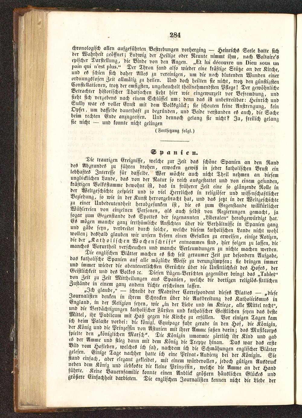 Die traurigen Ereignisse, welche zur Zeit das schöne Spanien an den Randdes AbgrnndcS zu führen drohen, erwecken gewiß in jeder katholischen Brust einlebhaftes Interesse für dasselbe. Wer möchte auch nicht Th?il nehmen an diesemunglücklichen Lanve, das von der Natur so reich ausgestattet und von einem gesunden,kräftigen VolkSstamme bewohnt ist, das in früherer Zeit eine so glänzende Rolle inder Weltgeschichte gespielt und so viel Herrliches in religiöser und wissenschaftlicherBeziehung, so wie in der Kunst hervorgebracht hat, und daS jetzt in der Weltgeschichtezu einer Unbedeutendheit herabgesnnken ist, die es zum Gegenstande willkürlicherWühlereien von einzelnen Personen, als auch selbst von Regierungen gemacht, jasogar zum Gegenstände deS Spottes der sogenannten „Liberalen " herabgewürdigt hat.ES mögen manche ganz irrthümliche Ansichten über die Verhältnisse in Spanien gangund gäbe seyn, verbreitet durch solche, welche diesem katholischen Lande nicht wohlwollen; deshalb glauben wir unsern Lesern einen Gefallen zu erweisen, einige Notizen,die der „Katholischen Wochenschrift" entnommen sind, hier folgen zu lassen, diemanches Vorurtheil verscheuchen und manche Verleumdungen zu nichte machen werden.