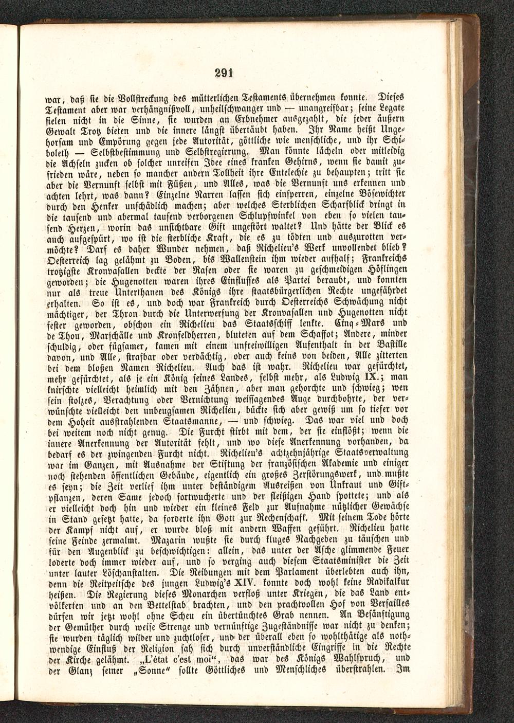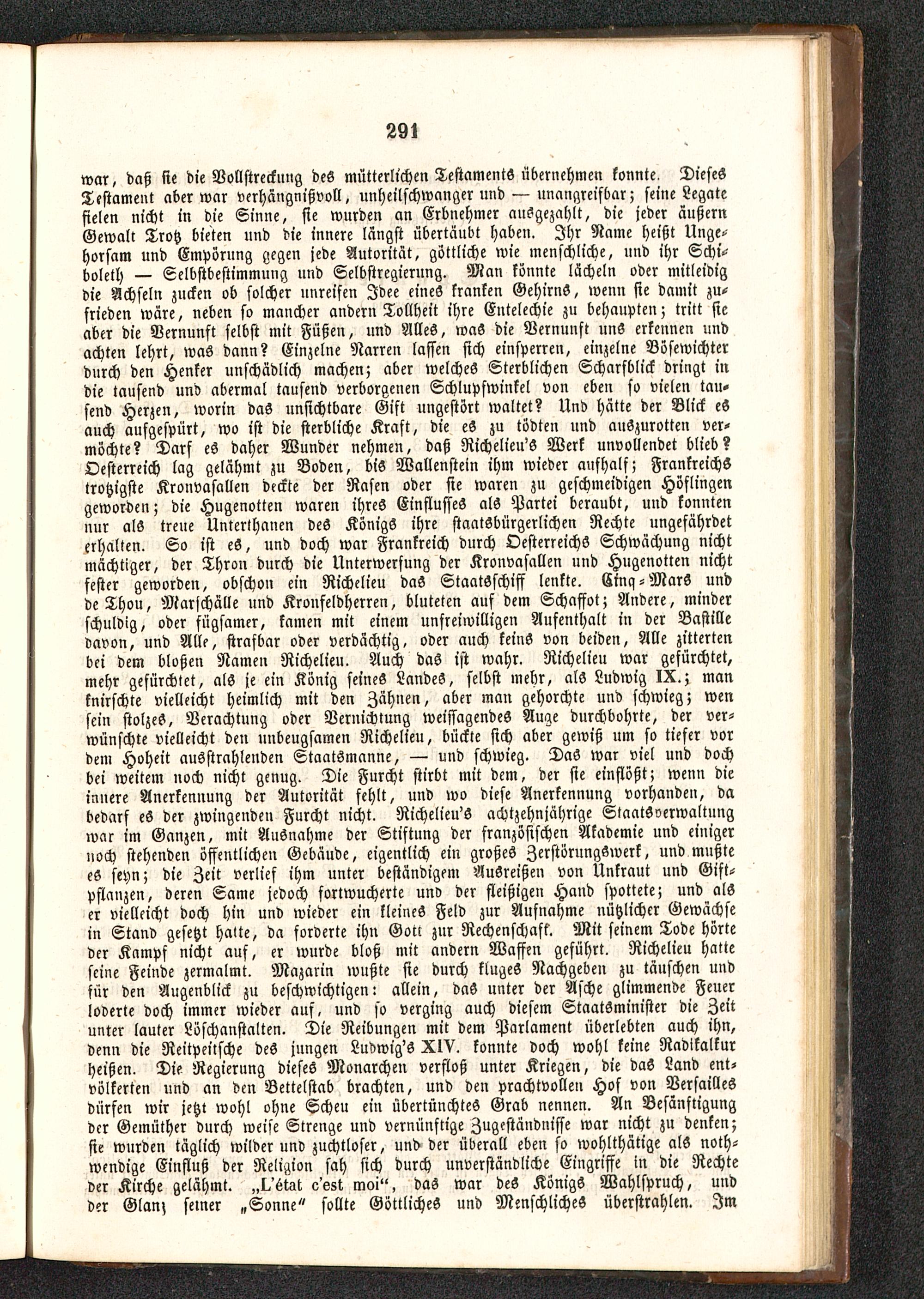 war, daß sie die Vollstreckung des mütterlichen Testaments »vernehmen konnte. DiesesTestament aber war verhängnißvoll, unheilschwanger und — unangreifbar; seine Legatefielen nicht in die Sinne, sie wurden an Erbnehmer ausgezahlt, die jeder äußernGewalt Trotz bieten und die innere langst übertäubt haben. Ihr Name heißt Unge-horsam und Empörung gegen jede Autorität, göttliche wie menschliche, und ihr Schi-boleth — Selbstbestimmung und Selbstregierung. Man könnte lächeln oder mitleidigdie Achseln zucken ob solcher unreifen Idee eines kranken Gehirns, wenn sie damit zu-frieden wäre, neben so mancher andern Tollheit ihre Entelechie zu behaupten; tritt sieaber die Vernunft selbst mit Füßen, und Alles, was die Vernunft uns erkennen undachten lehrt, was dann? Einzelne Narren lassen sich einsperren, einzelne Bösewichterdurch den Henker unschädlich machen; aber welches Sterblichen Scharsblick dringt indie tausend und abermal tausend verborgenen Schlupfwinkel von eben so vielen tau-send Herzen, worin das unsichtbare Gift ungestört waltet? Und hätte der Blick eSauch aufgespürt, wo ist die sterbliche Kraft, die eS zu tödten und auszurotten ver-möchte? Darf es daher Wunder nehmen, daß Richelieu'S Werk unvollendet blieb?Oesterreich lag gelähmt zu Boden, bis Wallenstein ihm wieder aufhalf; Frankreichs trotzigste Kronvasallen deckte der Rasen oder sie waren zu geschmeidigen Höflingengeworden; die Hugenotten waren ihres Einflusses als Partei beraubt, und konntennur als treue Unterthanen des Königs ihre staatsbürgerlichen Rechte ungefährdeterhalten. So ist eS, und doch war Frankreich durch Oesterreichs Schwächung nichtmächtiger, der Thron durch die Unterwerfung der Kronvasallen und Hugenotten nichtfester geworden, obschou ein Richelieu daS StaatSschiff lenkte. Cinq-MarS undde Thou, Marschälle und Kronfeldherren, bluteten auf dem Schaffst; Andere, minderschuldig, oder fügsamer, kamen mit einem unfreiwilligen Aufenthalt in der Bastille davon, und Alle, strafbar oder verdächtig, oder auch keinS von beiden, Alle zittertenbei dem bloßen Namen Richelieu. Auch das ist wahr. Richelieu war gefürchtet,mehr gefürchtet, als je ein König seines Landes, selbst mehr, als Ludwig IX. ; manknirschte vielleicht heimlich mit den Zähnen, aber man gehorchte und schwieg; wensein stolzes, Verachtung oder Vernichtung weissagendes Auge durchbohrte, der ver-wünschte vielleicht den unbeugsamen Richelieu, bückte sich aber gewiß um so tiefer vordem Hoheit ausstrahlenden Staatsmanne, — und schwieg. DaS war viel und dochbei weitem noch nicht genug. Die Furcht stirbt mit dem, der sie einflößt; wenn dieliniere Anerkennung der Autorität fehlt, und wo diese Anerkennung vorhanden, dabedarf eS der zwingende» Furcht nicht. Richelieu'S achtzehnjährige Staatsverwaltungwar im Ganzen, mit Ausnahme der Stiftung der französischen Akademie und einigernoch stehenden öffentlichen Gebäude, eigentlich ein großes Zerstörungswerk, und mnßtees seyn; die Zeit verlief ihm unter beständigem AuSreißen von Unkraut und Gift-pflanzen, deren Same jedoch fortwucherte unv der fleißigen Hand spottete; und alser vielleicht doch hin und wieder ein kleines Feld zur Aufnahme nützlicher Gewächsein Stand gesetzt halte, da forderte ihn Gott zur Rechenschaft. Mit seinem Tode hörteder Kampf nicht auf, er wurde bloß mit andern Waffen geführt. Richelieu hatteseine Feinde zermalmt. Mazarin wußte sie durch kluges Nachgeben zu täuschen undfür den Augenblick zu beschwichtigen: allein, daS unter der Asche glimmende Feuerloderte doch immer wieder auf, und so verging auch diesem StaatSminister die Zeitunter lauter Löschanstalten. Die Reibungen mit dem Parlament überlebten auch ihn,denn die Reitpeitsche des jungen Ludwig'S XIV. konnte doch wohl keine Radikalkurheißen. Die Regierung dieses Monarchen verfloß unter Kriegen, die daS Land ent-völkerten und an den Bettelstab brachten, und den prachtvollen Hof von Versailles dürfen wir jetzt wohl ohne Scheu ein übertünchteS Grab nennen. An Besänftigungder Gemüther durch weise Strenge und Vernünftige Zugeständnisse war nicht zu denken;sie wurden täglich wilderund zuchtloser, und der überall eben so wohlthätige als noth-wendige Einfluß der Religion sah sich durch unverständliche Eingriffe in die Rechteder Kirche gelähmt. „l/6wt esst moi", das war deS Königs Wahlspruch, uudder Glan; seiner „Sonne " sollte Göttliches und Menschliches überstrahlen. Im