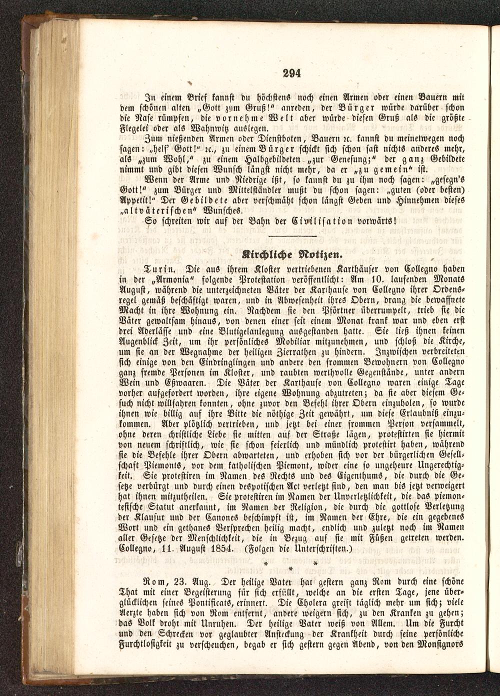 Rom, 23. Aug. Der heilige Vater har gestern ganz Rom durch eine schoneThat mit einer Begeisterung für sich erfüllt, welche an die ersten Tage, jene über-glücklichen seines PontificatS, erinnen. Die Cholera greift täglich mehr um sich; vieleAerzte haben sich von Rom entfernt, andere weigern sich, zu den Kranken zu gehen;das Volk drohr mit Unruhen. Der heilige Vater weiß von Allem. Um die Furchtund den Schrecken vor geglaubter Anstcckung der Krankheit durch seine persönlicheFurchtlosigkeit zu verscheuchen, begab er sich gestern gegen Abend, von den MonsignorS