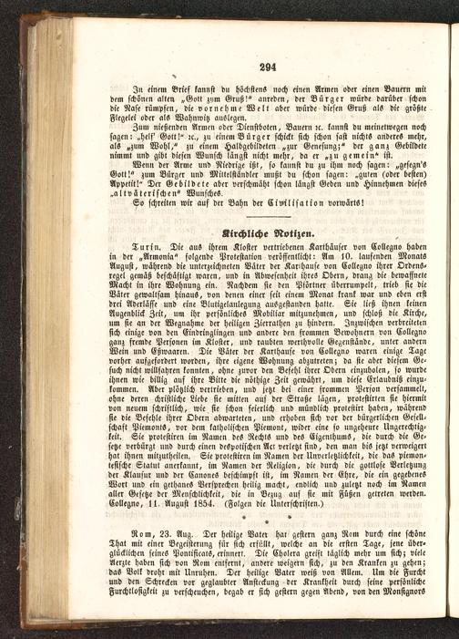 Turin . Die auS ihrem Kloster vertriebenen Karthäuser von Collegno habenin der „Armonia" folgende Protestation veröffentlicht: Am 10. laufenden MonatsAugust, während die unterzeichneten Väter der Karlhause von Collegno ihrer Ordens-regel gemäß beschäftigt waren, und in Abwesenheit ihres Obern, drang die bewaffneteMacht in ihre Wohnung ein. Nachdem sie den Pförtner überrumpelt, trieb sie dieVäter gewaltsam hinaus, von denen einer seit einem Monctt krank war und eben erstdrei Aderlässe und eine Blutigelanlegung ausgestanden hatte. Sie ließ ihnen keinenAugenblick Zeit, um ihr persönliches Mobiliar mitzunehmen, und schloß die Kirche,um sie an der Wegnahme der heiligen Zierralhen zu hindern. Inzwischen verbreitetensich einige von den Eindringlingen und andere den frommen Bewohnern von Collegnoganz fremde Personen im Kloster, und raubten werthvolle Gegenstände, unter andernWein und Eßwaaren. Die Väter der Karlhause von Collegno waren einige Tagevorher aufgefordert worden, ihre eigene Wohnung abzutreten; da sie aber diesem Ge-such nicht willfahren konnten, ohne zuvor den Befehl ihrer Obern einzuholen, so wurdeihnen wie billig aus ihre Bitte die nöthige Zeit gewährt, um diese Erlaubniß einzu-kommen. Aber plötzlich vertrieben, und jetzt bei einer frommen Person versammelt,ohne deren christliche Liebe sie mitten auf der Straße lägen, protxstirten sie hiermitvon neuem schriftlich, wie sie schon feierlich und mündlich prolestirt haben, währendsie die Befehle ihrer Obern abwarteten, und erhoben sich vor der bürgerlichen Gesell-schaft PiemontS, vor dem katholischen Piemont, wider eine so ungeheure Ungerechtig-keit. Sie protestiren im Namen des Rechts und des Eigenthums, die durch die Ge-setze verbürgt und durch einen despotischen Act verletzt sind, den man bis jetzt verweigerthat ihnen mitzutheilen. Sie Protestiren im Namen der Unvcrletzlichkeit, die daS piemon«tesische Statut anerkannt, im Namen der Religion, die durch die gottlose Verletzungder Klausur uud der CauoneS beschimpft ist, im Namen der Ehre, die ein gegebenesWort und ein gethanes Versprechen heilig macht, endlich und zuletzt noch im Namenaller Gesetze der Menschlichkeit, die in Bezug auf sie mit Füßen getreten werden.Collegno, 11. August 1854. (Folgen die Unterschriften.)