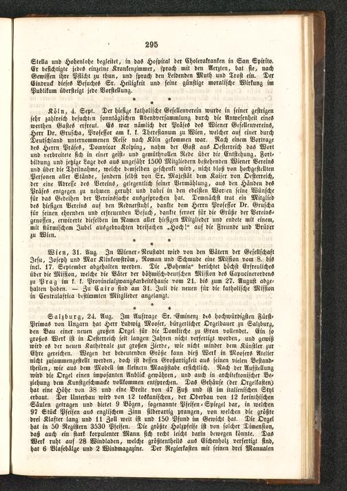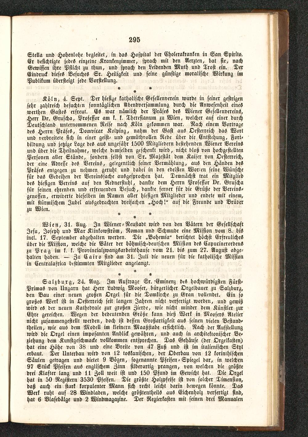 Salzburg , 2<t. Aug. Im Auftrage Sr.-Eminenz beS hochwürdigsten Fürst-PrimaS von Ungarn hat Herr Ludwig Mooser, bürgerlicher Orgelbauer zu Salzburg ,den Bau einer nenen großen Orgel für die Domkirche zu Gran vollendet. Ein sogroßes Werk ist in Oesterreich seit langen Jahren nicht verfertigt worden, und gewißwird eS der neuen Kathedrale zur großen Zierde, wie nicht minder dem Künstler zurEhre gereichen. Wegen der bedeutenden Große kann dieß Werk in Moosers Ateliernicht zusammengestellt werden, doch ist dessen Großartigkeit auS seinen vielen Bestand-theilen, wie aus dem Modell im kleinern Maaßstabe ersichtlich. Nach der Aufstellungwird die Orgel einen imposanten Anblick gewähren, und auch in architektonischer Be-ziehung dem Kunstgeschmacke vollkommen entsprechen. DaS Gehäuse (der Orgelkasten)hat eine Höhe von 38 und eine Breite von 47 Fuß und ist im italienischen Stylerbaut. Der Unterbau wird von 12 toSkanischen, der Oberbau von 12 korinthischenSäulen getragen und bietet 9 Bögen, sogenannte Pfeifen-Spiegel dar, in welchen97 Stück Pfeifen auS englischem Zinn silberartig prangen, von welchen die größtedrei Klafter lang und 11 Zoll weit ist und 150 Pfund im Gewicht hat. Die Orgelhat in 50 Registern 3530 Pfeifen. Die größte Holzpfeife ist von solcher Dimension,daß auch ein stark korpulenter Mann sich recht leicht darin bewegen konnte. DasWerk ruht auf 23 Windladen, welche größtentheilö auS Eichenholz verfertigt sind,hat 6 Blasebälge und 2 Windmagazine. Der Regierkasten mit seinen drei Manualen