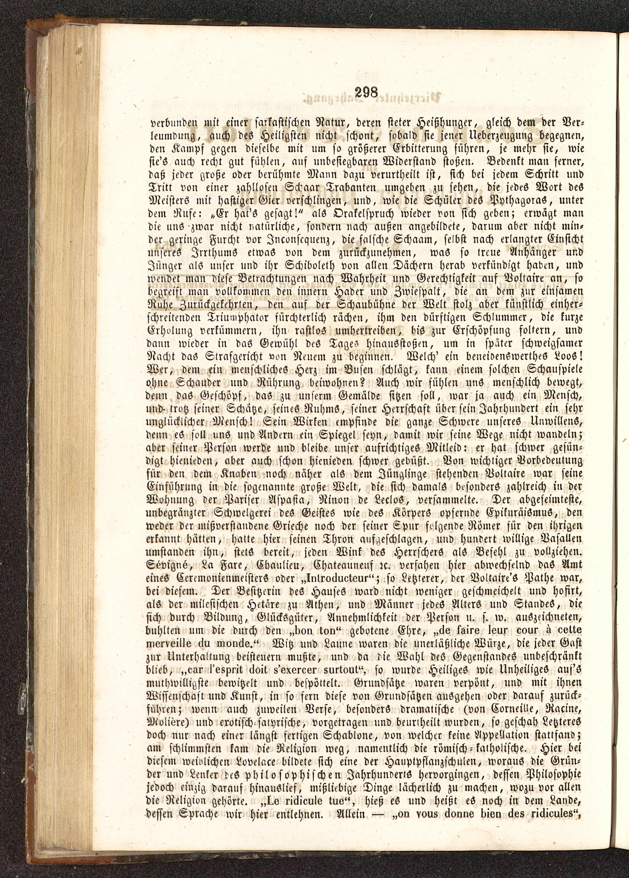 verbünden mit ei'ner sarkastischen Natur, deren steter Heißhunger, gleich dem der Ver-leumdung, auch des Heiligsten nicht schont, sobald sie jener Ueberzeugung begegnen,den Kampf gegen dieselbe mit um so größerer Erbitterung sichren, je mehr sie, wiesie'S anch recht gut fühlen, auf unbesiegbaren Widerstand stoßen. Bedenkt man ferner,daß jeder große oder berühmte Mann dazu verurtheilt ist, sich bei jedem Schritt undTritt von einer zahllosen Schaar Trabanten umgeben zu sehen, die jedes Wort deSMeisters mit hastiger Gier verschlingen, und, wie die Schüler deö PythagoraS , unterdem Rufe: „Er hac's gesagt!" als Orakelspruch wieder von sich geben; erwägt mandie uns zwar nicht natürliche, sondern »ach außen angebildete, darum aber nicht min,der geringe Furcht vor Jnconscquenz, die falsche Schämn, selbst nach erlangter Einsichtunseres Irrthums etwas von dem zurückzunehmen, was so treue Anhänger undJünger als unser und ihr Schibolcth von allen Dächern herab verkündigt haben, undwendet man diese Betrachtungen nach Wahrheit und Gerechtigkeit auf Voltaire an, sobegreift man vollkommen den innern Hader und Zwiespalt, die an dem zur einsamenRuhe Zurückgekehrien, den auf der Schaubühne der Welt stolz aber künstlich einher-schreitenden Triumphator fürchterlich rächen, ihm den dürftigen Schlummer, die kurzeErholung verkümmern, ihn rastlos umhertreiben, bis zur Erschöpfung foltern, unddann wieder in das Gewühl des Tages Hinansstoßen, um in später schweigsamerNacht das Strafgericht von Neuem zu beginnen. Welch' ein beneioenSwertheS LooS!Wer, dem ein menschliches Herz im Busen schlägt, kann einem solchen Schauspieleohne Schauder und Rührung beiwohnen? Anch wir fühlen uns menschlich bewegt,denu das Geschöpf, das zu unserm Gemälde sitzen soll, war ja auch ein Mensch,und- Irvtz seiner Schätze, seines Ruhms, seiner Herrschaft über sein Jahrhundert ein sehrunglücklicher Mensch! Sein Wirken empfinde die ganze Schwere unseres Unwillens,denn eS soll uns und Andern ein Spiegel seyn, damit wir seine Wege nicht wandeln;aber seiner Person werde und bleibe unser aufrichtiges Mitleid: er hat schwer gesün-digt hienieden, aber auch schon hienieden schwer gedüßt. Von wichtiger Vorbedeutungfür den dem Knaben noch näher als dem Jünglinge stehenden Voltaire war seineEinführung in die sogenannte große Welt, die sich damals bt-sonders zahlreich in derWohnung der Pariser Aspasia, Ninon de LecloS, versammelte. Der abgefeimteste,unbegränzter Schwelgerei des Geistes wie deS Körpers opfernde EpikuräiSmus, denweder der mißverstandene Grieche noch der seiner Cpur folgende Römer für den ihrigenerkannt hätten, hatte hier seinen Thron aufgeschlagen, und hundert willige Vasallenumstanden ihn, stets bereit, jeden Wink deS Herrschers als Besehl zu vollziehen.Sevigne, La Fare, Ehaulieu, Chateaunenf zc. versahen hier abwechselnd daS Amteines CeremonienmeisterS oder „Irilrodueteur"; so Letzterer, der Voltaire'S Pathe war,bei diesem. Der Besitzerin deS Hauses ward nicht weniger geschmeichelt und hofirt,als der milesischcn Hetäre zu Athen , und Männer jedes Allers und Standes, diesich durch Bildung, Glücksgüter, Annehmlichkeit der Person u. s. w. auszeichneten,buhlten nm die durch den „von ton" gebotene Ehre, „de tsire leur cour » cettemerveüliz du inonde." Witz und Laune waren die unerläßliche Würze, die jeder Gastzur Unterhaltung beisteuern mußte, und da die Wahl des Gegenstandes unbeschränktblieb, ,,car I'esprit doit. s'exereer surtcmt", so wurde Heiliges wie UnheiligeS auj'Smnibwilligste bewitzelt und bespöttelt. Grundsätze waren verpönt, und mit ihnenWissenschaft und Kunst, in so fern diese von Grundsätzen ausgehen oder darauf zurück-führen; wenn auch zuweilen Verse, besonders dramatische (von Corneille, Racine,Mvliere) und erotisch-satyrische, vorgetragen und beuriheilt wurden, so geschah Letzteresdoch nur nach einer längst fertigen Schablone, von welcher keine Appellation stattfand;am schlimmsten kam die Religion weg, namentlich die römisch-katholische . Hier beidiesem weiolichen Lovelace bildete sich eine der Hauptpflanzschnlen, woraus die Grün-der und Lenker deS philosophischen Jahrhunderts hervorgingen, dessen Philosophiejedoch einzig daraus hinauslief, mißliebige Dinge lächerlich zu machen, wozu vor allendie Religion gehörte. „I.e ridieule tu«", hieß eS und heißt eS noch in dem Lande,dessen Sprache wir hier entlehnen. Allein — „c>n vous dorme dien de8 ridieules"