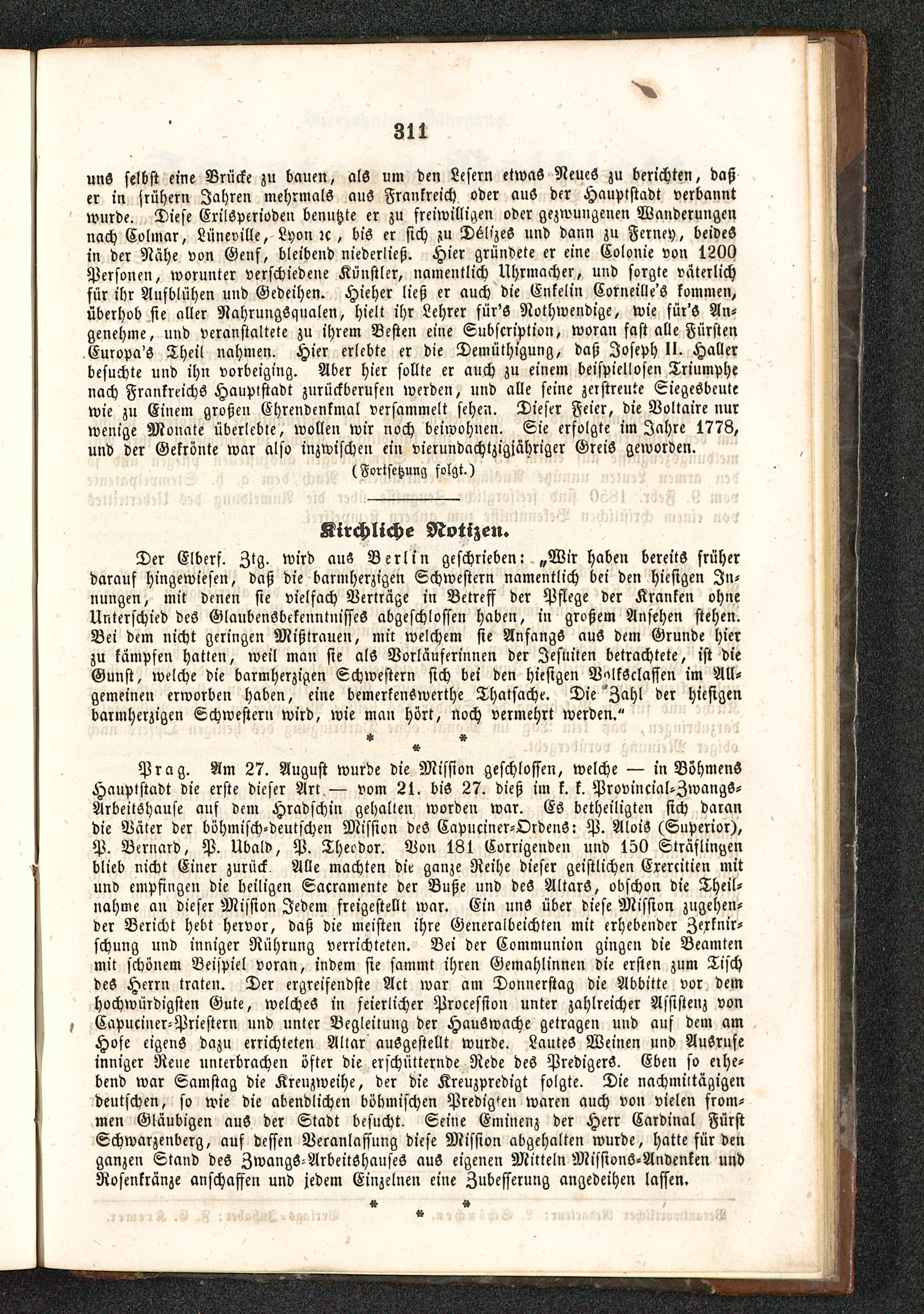Prag. Am 27. August wurde die Mission geschlossen, welche — in Böhmens Hauptstadt die erste dieser Art— vom 21. bis 27. dieß im k. k. Provincial-ZwangS-ArbeitShause auf dem Hradschin gehalten worden war. Es bctheiligten sich darandie Väter der böhmisch-deutschen Mission des Capuciner-OrdenS: P. AloiS (Superior),P. Bernard, P. Ubald, P. Theodor. Von 181 Eorrigenden und 150 Sträflingenblieb nicht Einer zurück Alle machten die ganze Reihe dieser geistlichen Exercitien mitund empfingen die Keiligen Sacramente der Buße und des AltarS, obschon die Theil-nahme an dieser Mission Jedem freigestellt war. Ein unS über diese Mission zugehen-der Bericht hebt hervor, daß die meisten ihre Generalbeichten mit erhebender Zerknir-schung und inniger Rührung verrichteten. Bei der Communion gingen die Beamtenmit schönem Beispiel voran, indem sie sammt ihren Gemahlinnen die ersten zum Tischdes Herrn traten. Der ergreifendste Act war am Donnerstag die Abbitte vor demhochwürdigsten Gute, welches in feierlicher Procession unter zahlreicher Assistenz vonCapuciner-Priestern und unter Begleitung der Hauswache getragen und auf dem amHofe eigens dazu errichteten Altar ausgestellt wurde. LauteS Weinen und AuSruseinniger Reue unterbrachen öfter die erschütternde Rede des Predigers. Eben so erhe-bend war Samstag die Kreuzweihe, der die Kreuzpredigt folgte. Die nachmittägigendeutschen, so wie die abendlichen böhmischen Predigten waren auch von vielen from-men Gläubigen auS der Stadt besucht. Seine Eminenz der Herr Cardinal FürstSchwarzenberg, auf dessen Veranlassung diese Mission abgehalten wurde, hatte für denganzen Stand des ZwangS-ArbeitShauses auS eigenen Mitteln Missions-Andenken undRosenkränze anschaffen und jedem Einzelnen eine Zubesserung angedeihen lassen.