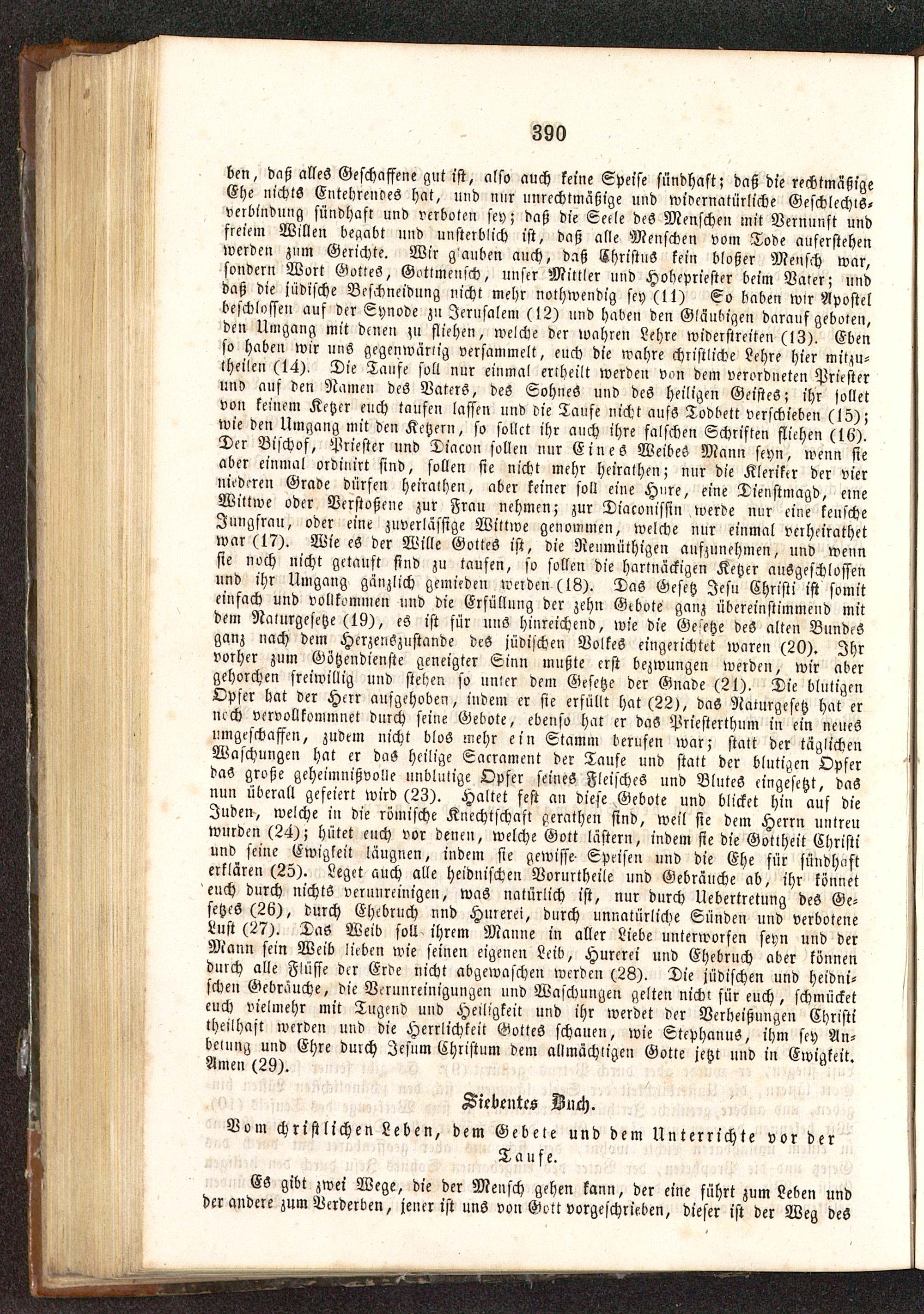 ben, daß alles Geschaffene gut ist, also auch keine Speise sündhaft; daß die rechtmäßigeEhe nichts Entehrendes hat, und nur unrechtmäßige und widernatürliche Geschlechts-Verbindung sündhaft und verboten sey; daß die Seele des Menschen mit Vernunft undfreiem Willen beaabt »nd unsterblich ist, daß alle Menschen vom Tode auferstehenwerden zum Gerichte. Wir g'auben auch, daß Christus kein bloßer Mensch war,sondern Wort Gottes, Gottmenfch, unser Mittler und Hohepriester beim Vater; unddaß die jüdische Beschneidung nicht mehr nothwendig sey (11) So haben wir Apostelbeschlossen auf der Synode zn Jerusalem (12) und haben den Gläubigen darauf geboten,den Umgang mit denen zu fliehen, welche der wahre» Lehre widerstreiten (13), Ebenso haben wir u»S gegenwärtig versammelt, euch die wahre christliche Lehre hier mitzu-theilen (14), Die Taufe soll nur einmal ertheilt werden von dem verordneten Priesterund auf den Namen des Vaters, des SohneS und des heiligen Geistes; ihr jolletvon keinem Ketzer euch taufen lassen und die Taufe nicht ausS Todbett verschieben (15);wie den Umgang mit den Ketzern, so sollet ihr auch ihre falschen Schriften fliehen (16).Der Bischof, Priester und Diacon sollen nur Eines WeibeS Mann seyn, wenn sieaber einmal ordmirt sind, sollen sie nicht mehr hcirathen; nur die Kleriker der vierniedi-ren Grade dürfen heiraiheu, aber keiner soll eine Hme, eine Tienstmagd, eineWittwe oder Verstoßene zur Frau nehmen; zur Diaconissin werde nur eine keuscheJungfrau, oder eine zuverlässige Wittwe genommen, welche nur eiumal vcrheirathetwar (17). Wie eö der Wille Gottes ist, die Nenmüthigen aufzunehmen, unv wennsie noch nicht getauft sind zu taufen, so sollen die hartnäckigen Ketzer ausgeschlossenund ihr Umgang gänzlich gemieden werden (18). Das Gesetz Jesu Christi ist somiteinfach und vollkommen und die Erfüllung der zehn Gebote ganz übereinstimmend mitdem Naturgesetze (19), eS ist für uuS hinreichend, wie die Gesetze deS alten BundiSganz nach dem HerzenSznstande deS jüdischen Volkes eingerichtet waren (20). Ihrvorher zum Götzendienste geneigter Sinn mußte erst bezwungen werden, wir abergehorchen freiwillig und stehen so unier dem Gesetze der Gnade (ZI). Die blutigenOpfer hat der Herr ausgehoben, indem er sie erfüllt hat (22), das Naturgesetz hat ernech vervollkommnet durch seine Gebote, ebenso hat er das Priesterthum in ein neuesumgeschaffcn, zudem uicht blos mehr ein Stamm berufen war; statt der täglichenWaschungen hat er das heilige Sacrament der Taufe und statt der blutigen Opferdas große geheimnißvolle unblutige Opfer seines Fleisches und Blutes eingesetzt, dasnun überall gefeiert wird (23). Haltet fest an diese Gebote und blicket hin auf dieJuden, welche in die römische Knechtschaft gerathen sind, weil sie dem Herrn untreuwurden (24); hütet euch vor denen, welche Gott lästern, indem sie die Gottheit Christiunv seine Ewigkeit läugnen, indem sie gewisse- Speisen und die Ehe für sündhafterklären (25). Leget auch alle heidnischen Norurlheile und Gebräuche ab, ihr könneteuch durch nichts verunreinigen, was natürlich ist, nur durch Uebertretung deö Ge-setzes (26), durch Ehebruch und Hnrerei, durch unnatürliche Sünden und verboteneLust (27). Das Weib soll ihrem Manne in aller Liebe unterworfen seyn und derMann sein Weib lieben wie seinen eigenen Leib, Hurerei und Ehebruch aber könnendurch alle Flüsse der Erde nicht abgewaschen werden (28). Die jüdischen und heidni-schen Gebräuche, die V^ruureiuiguugen und Waschungen gelten nicht für euch, schmücketeuch vielmehr mit Tugeud und Heiligkeit und ihr werdet der Verheißungen Christi ihcilhafr werden und die Herrlichkeit Gottes schauen, wie StephanuS , ihm sey An-betung und Ehre durch Jesum Christum dem allmächtigen Gotte jetzt und in Ewigkeit.Amen (29).