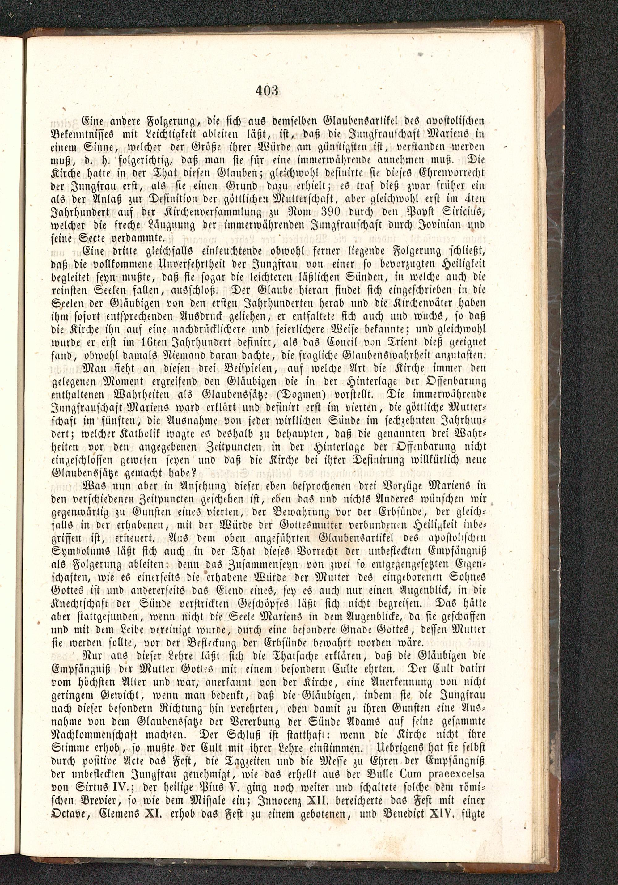 Eine andere Folgerung, die sich aus demselben Glaubensartikel des apostolischenBekenntnisses mit Leichtigkeit ableiten läßt, ist, daß die Jungfrauschaft Mariens ineinem Sinne, welcher der Größe ihrer Würde am günstigsten ist, verstanden werdenmuß, d. h, folgerichtig, daß man sie für eine immerwährende annehmen muß. DieKirche hatte iu der That diesen Glauben; gleichwohl definirte sie dieses Ehrenvorrechtder Jungfrau erst, als sie einen Grunv dazu erhielt; eS traf dieß zwar früher einals der Anlaß zur Definition der göttlichen Mutterschaft, aber gleichwohl erst im 4tenJahrhundert auf der Kirchenversammlung zu Rom 390 vurch den Papst SiricmS,welcher die freche Läugnung der immerwährenden Jnngfranschaft durch Jovinian undseine Secte verdammte.
