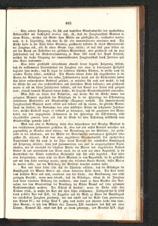 Eine dritte gleichfalls einleuchtende obwohl ferner liegende Folgerung schließt,daß die vollkommene Unversehrtheit der Jungfrau von einer so bevorzugten Heiligkeitbegleitet seyn mußte, daß sie sogar die leichteren läßlichen Sünden, iu welche auch diereinsten Seelen fasten, ausschloß. Der Glaube hieran findet sich eingeschrieben in dieSeelen der Gläubigen von den ersten Jahrhunderten herab und die Kirchenväter habenihm sofort entsprechenden Ausdruck geliehen, er entfaltete sich auch und wuchs, so daßdie Kirche ihn auf eine nachdrücklichere und feierlichere Weise bekannte; und gleichwohlwurde er erst im löten Jahrhundert definirt, als das Concil von Trient dieß geeignetfand, obwohl damals Niemand daran dachte, die fragliche Glaubenswahrheit anzutasten.