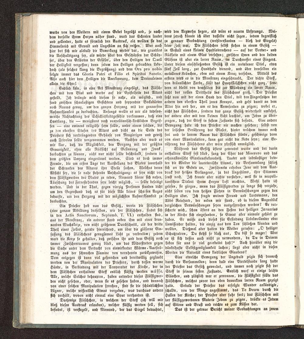 Endlich kam, in eine Art Monstranz eingefügt, das Fläsch -chcn mit dem Blut und wurde auf die Epistclseite des Altarsgestellt. Ich drängte mich diesem so nahe, als möglich, undfand zwischen schaulustigen Gesichtern und foppenden Bocksbärtennoch Raums genug, um dc» ganzen Hergang mit der genauestenAufmerksamkeit zu beobachte». Anfangs wollte es mir als tadelns-werthc Nichtachtung des SchicklichkcitsgefühlS vorkommen, daß eineHandlung, die — wenigstens nach neapolitanisch-kirchlichen Begrif-fen — eine eminent religiöse seyn sollte, unter einem solchen, biszu den obersten Stusen deS Altars und dicht an die Seite desPriesters sich vordrängenden Gehäuse von Neugierigen und gewißauch Frivolen sollte vorgenommen werden. Nachher aber ward eSmir klar, daß die Möglichkeit, den Vorgang mit der größtenGenauigkeit, ohne alle Rücksicht auf Gesinnung und Zweck,beobachten zu können, nicht nur nicht sollte beschränkt, sondern indem größten Uinrang eingeräumt werden. Sind cS doch immerFremde, die am ersten Tage der Ansstcllunq deS Blutes innerhalbder Schranken des Altares ihre Stelle suchen. Welches derenAbsicht sey, die so nahe stehende Anschuldigung: es scye nicht vondem Flüssigwcrden des BluteS zu reden, Niemand könne sich nahen,Täuschung deS Ferncstehcndcn seye leicht möglich, — sollte beseitigtwerden. Und in der That, gegen vierzig Personen stunden dichtum den Gegenstand daß eS für diese Alle keines schaffen Augesbedürfte, um dcu Hergang mit der möglichsten Aufmerksamkeit zubeobachten.
