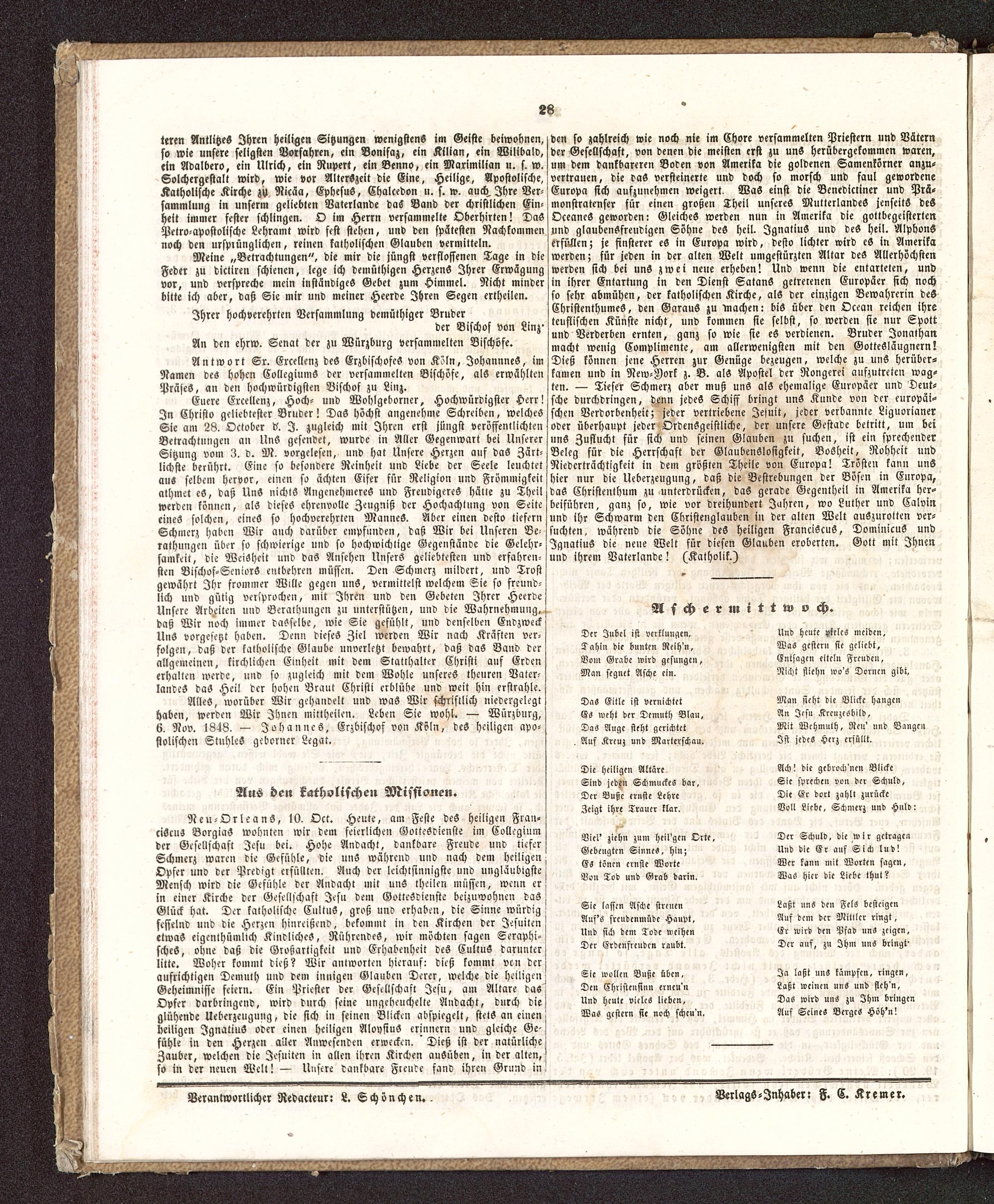 Antwort Sr. Excellenz deS ErzbischofcS von Köln, JohannneS, imNamen des hohen CollegiumS der versammelten Bischöfe, als erwähltenPräses, an den hochwürdigsten Bischof zu Linz.