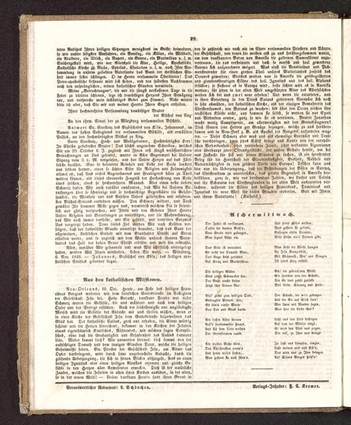 Neu-Orleans, 10. Oct. Heute, am Feste des heiligen Frau-ciScuS BorgiaS wohnten wir dem feierlichen Gottesdienste im Kollegiumder Gesellschaft Jesu bei. Hohe Andacht, dankbare Freude und tieferSchmerz waren die Gefühle, die uns während und nach dem heiligen jOpfer und der Predigt erfüllten. Auch der leichtsinnigste und ungläubigste!Mensch wird die Gefühle der Andacht mit unS theilen müssen, wenn er!in einer Kirche der Gesellschaft Jesu dem Gottesdienste beizuwohnen das!Glück hat. Der katholische Cultus, groß und erhaben, die Sinne würdig !fesselnd und die Herzen hinreißend, bekommt in den Kirchen der Jesuiten ^ etwas eigenthümlich Kindliches, Rührendes, wir möchten sagen Seraph!-!schcS, ohne daß die Großartigkeit und Erhabenheit des Cultus darunter!litte. Woher kommt dieß? Wir antworten hierauf: dieß kommt vcn der^aufrichtigen Demuth und dem innigen Glauben Derer, welche die heiligen !Geheimnisse feiern. Ein Priester der Gesellschaft Jesu , am Altare das!Opfer darbringend, wird durch seine ungcheuchelte Andacht, durch die!glühende Ueberzeugung, die sich in seinen Blicken abspiegelt, stets an einen!heiligen JgnatiuS oder einen heiligen AloysiuS erinnern und gleiche Ge-fühle in den Herzen aller Anwesenden erwecken. ' Dieß ist der natürlicheZauber, welchen die Jesuiten in allen ihren Kirchen ausüben, in ver alten,so in der neuen Welt! — Unsere dankbare Freude fand ihren Grund in!