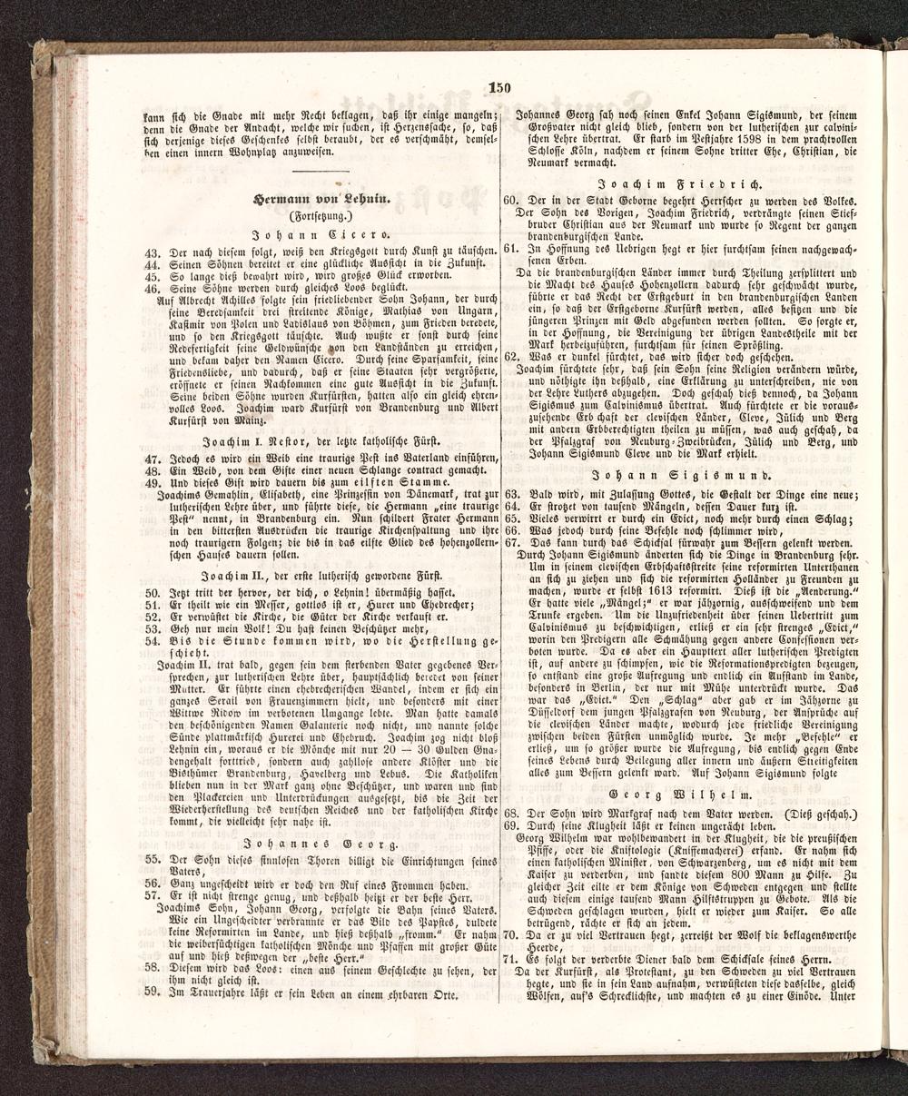 Aus Albrecht Achilles folgte sein friedliebender Sohn Johann , der durchseine Beredsamkeit drei streitende Könige, Mathias von Ungarn,Kasimir von Polen und LadiSlauS von Böhmen , zum Frieden beredete,und so den KriegSgolt täuschte. Auch wußte er sonst durch seineRedefcrtigkeit seine Geldwünsche Hon den Landständen zu erreichen,und bekam daher den Namen Cicero . Durch seine Sparsamkeit, seineFriedensliebe, und dadurch, daß er seine Staaten sehr vergrößerte,eröffnete er seinen Nachkommen eine gute AuSstcht in die Zukunft.Seine beiden Söhne wurden Kurfürsten, hatten also ein gleich ehren-volles LooS. Joachim ward Kurfürst von Brandenburg und AlbertKurfürst von Mainz .