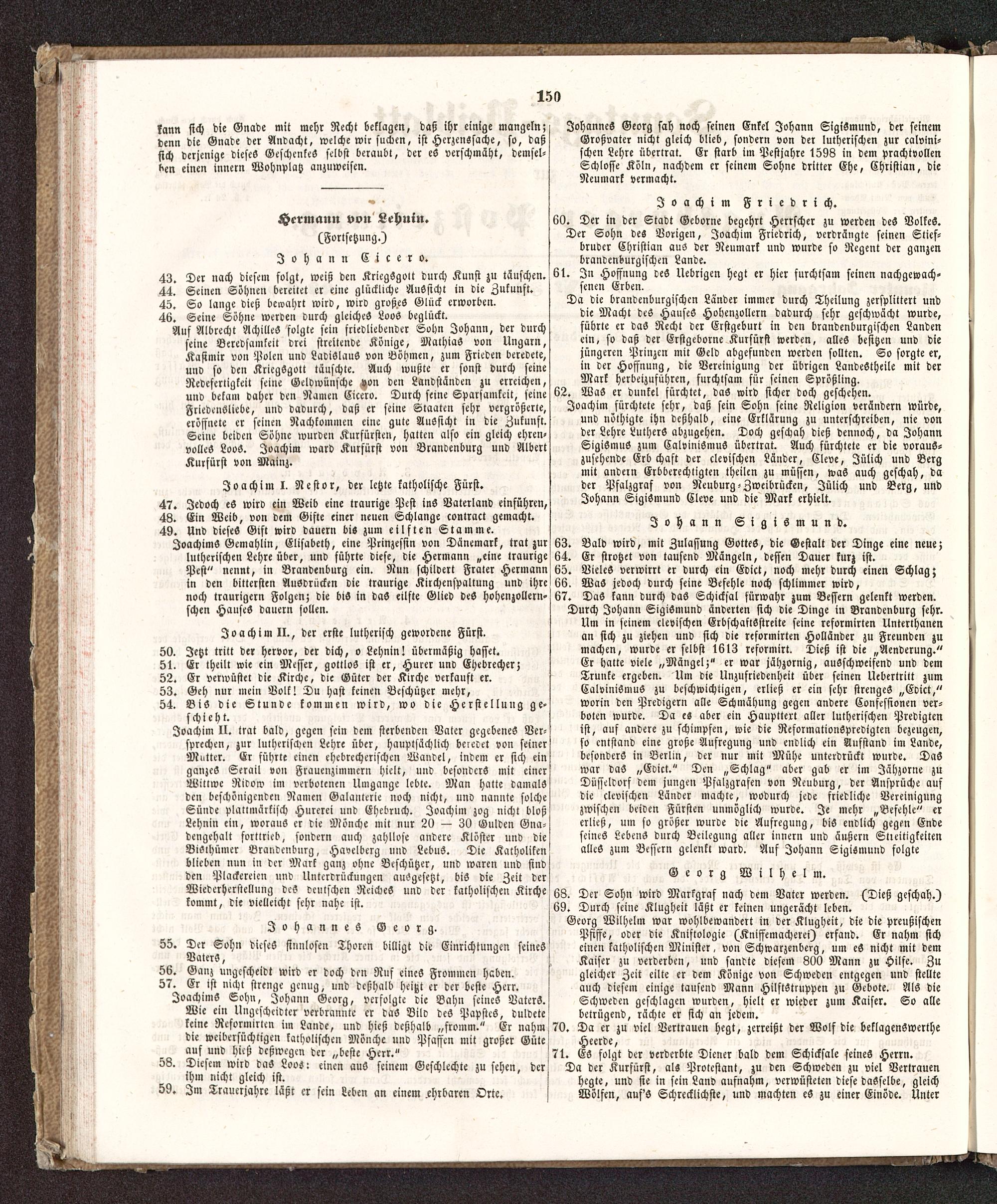 lutherischen Lehre über, und führte diese, die Hermann „eine traurigePest" nennt, in Brandenburg ein. Nun schildert Frater Hermannin den bittersten Ausdrücken die traurige Kirchenspaltung und ihrenoch traurigern Folgen; die bis in das eilsle Glied des hohenzollern -schen Hauses dauern sollen.