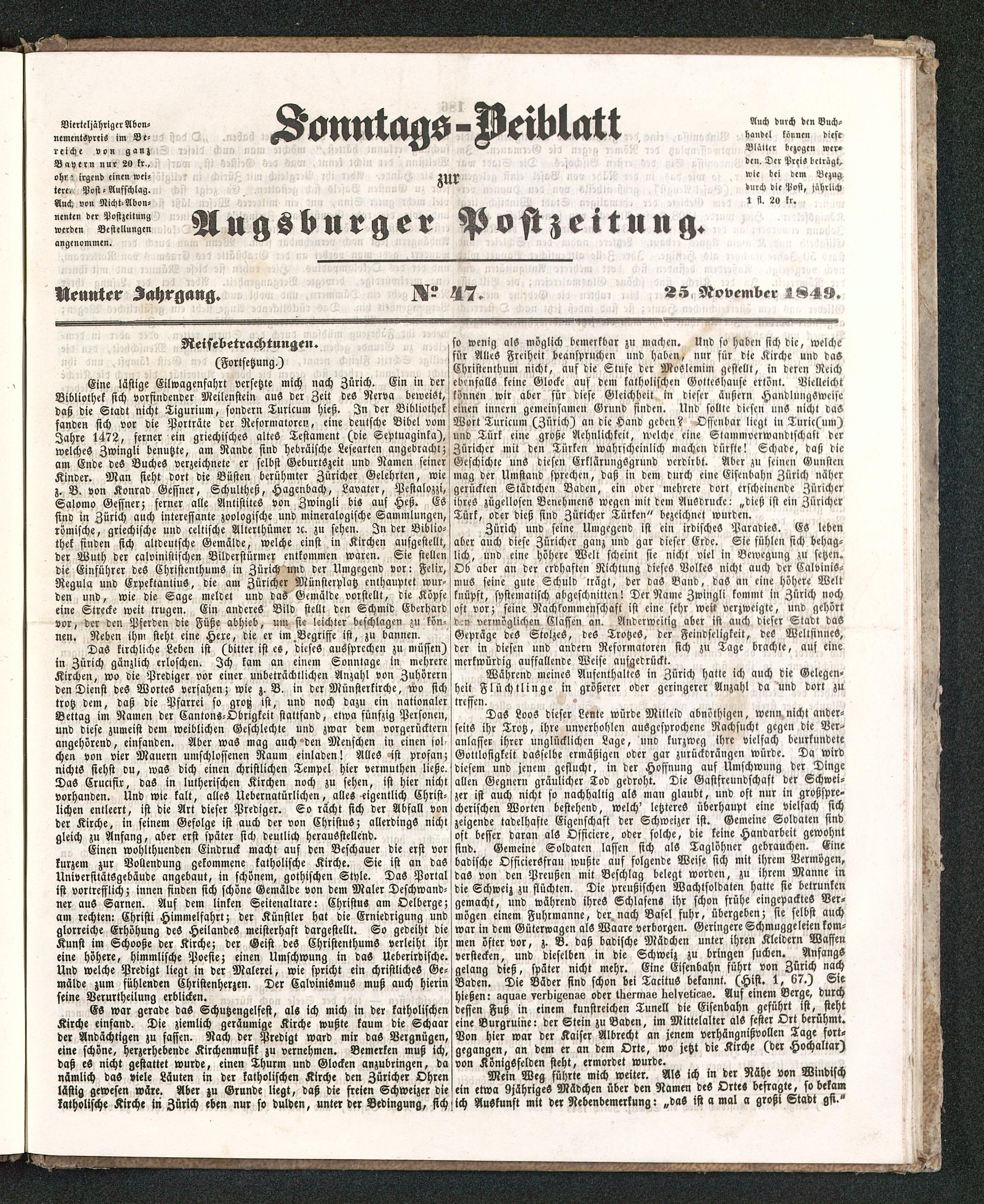 DaS LooS dieser Leute würde Mitleid abnöthigen, wenn nicht ander-seits ihr Trotz, ihre unverhohlen ausgesprochene Rachsucht gegen die Ver-anlasser ihrer unglücklichen Lage, und kurzweg ihre vielfach beurkundeteGottlosigkeit dasselbe ermäßigen oder gar zurückdrängen würde. Da wirddiesem und jenem geflucht, in der Hoffnung auf Umschwung der Dingeallen Gegnern gräulicher Tod gedroht. Die Gastfreundschaft der Schwei-zer ist auch nicht so nachhaltig als man glaubt, und oft nur in großspre-cherischen Worten bestehend, welch' letzteres überhaupt eine vielfach sichzeigende tadelhafte Eigenschaft der Schweizer ist. Gemeine Soldaten sindoft besser daran als Officiere, oder solche, die keine Handarbeit gewohntsind. Gemeine Soldaten lassen sich als Taglöhner gebrauchen. Einebadische OsficierSfrau wußte auf folgende Weise sich mit ihrem Vermögen,das von den Preußen mit Beschlag belegt worden, zu ihrem Manne indie Schweiz zu flüchten. Die preußischen Wachtsoldaten hatte sie betrunkengemacht, und während ihres Schlafens ihr schon frühe eingepacktes Ver-mögen einem Fuhrmanne, der. nach Basel fuhr, übergeben; sie selbst auchwar in dem Güterwagen als Waare verborgen. Geringere Schmuggeleien kom-men öfter vor, z. B. daß badische Mädchen unter ihren Kleidern Waffenverstecken, und dieselben in die Schweiz zu bringen suchen. Anfangsgelang dieß, später nicht mehr. Eine Eisenbahn führt von Zürich nachBaden. Die Bäder find schon bei TacituS bekannt. (Hist. 1, 67.) Siehießen: aguoe verbigenae oder tllermav llelvoticao. Auf einem Berge, durchdessen Fuß in einem kunstreichen Tunell die Eisenbahn geführt ist, stehteine Burgruine: der Stein zu Baden, im Mittelalter als fester Ort berühmt.Von hier war der Kaiser Albrecht an jenem verhängnißvollen Tage fort-gegangen, an dem er an dem Orte, wo jetzt die Kirche (der Hochaltar)von KönigSfelden steht, ermordet wurde.