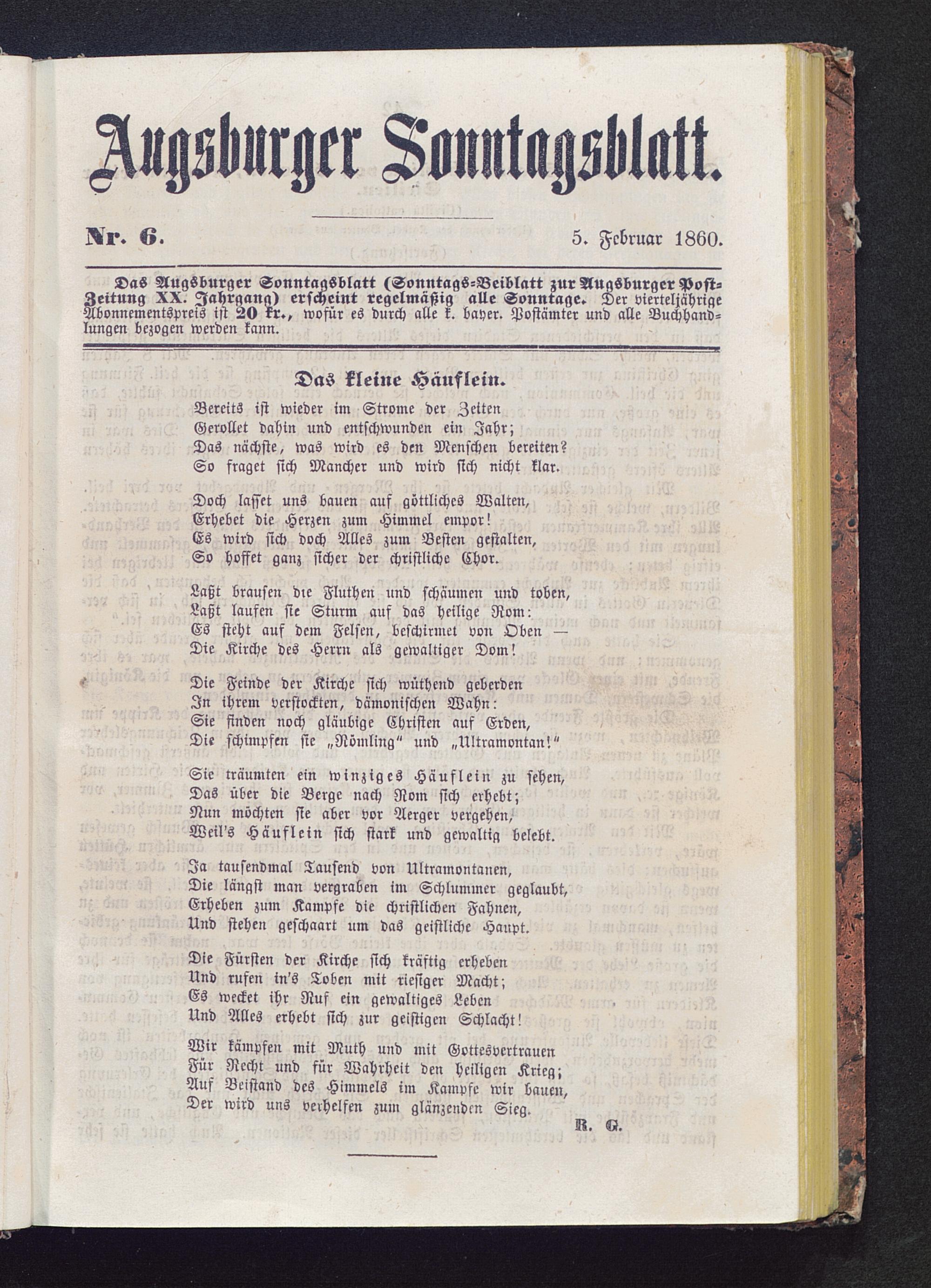 Das Augsburger Sonntagsblatt (Sonntags-Beiblatt zur Augsburger Post-Zeitung XX. Jahrgang) erscheint regelmäßig alle Sonntage» Der vierteljährigeAbonnementspreis ist 20 kr», wofür es durch alle k. bayer. Postämter und alle Buchhand-lungen bezogen werden kann.