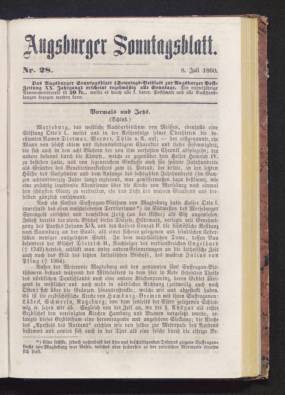 Das Augsburger Sonntagsblatt (Sonntags-Beiblatt zur Augsburger Post-Zeitung XX. Jahrgang) erscheint regelmäßig alle Sonntage. Der vierteljährigeAbonncmentsprcis ist 2tt kr», wofür es durch alle k. bayer. Postämter und alle Buchhand-lungen bezogen werden kann.