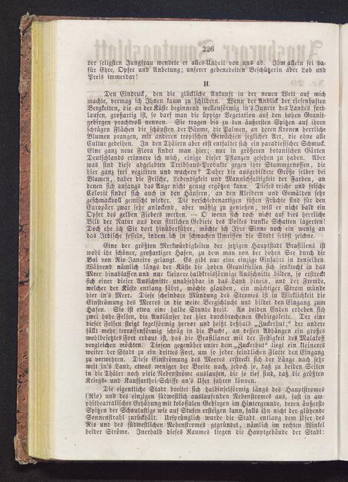 Den Eindruck, den die glückliche Ankunft in der neuen Welt auf michmachte, vermag ich Ihnen kaum zu schildern. Wenn der Anblick der riesenhaftenBergketten, die an der Küste beginnend wellenförmig in's Innere des Landes fort-laufen, großartig ist, so darf man die üppige Vegetation auf den hohen Granit-gebirgen prachtvoll nennen. Sie tragen bis zu den äußersten Spitzen auf ihrenschrägen Flächen die schönsten der Bäume, die Palmen, an deren Kronen herrlicheBlumen prangen, mit anderen tropischen Gewächsen jeglicher Art, die ohne alleCultur gedeihen. In den Thälern aber erst entfaltet sich ein paradiesischer Schmuck.Eine ganz neue Flora findet man hier; nur in größeren botanischen GärtenDeutschlands erinnere ich mich, einige dieser Pflanzen gesehen zu haben. Aberwas sind diese abgelebten Treibhaus-Produkte gegen ihre Stammgenossen, diehier ganz frei vegitiren und wuchern? Daher die ausgebildete Größe selber beiBlumen, daher die Frische, Lebendigkeit und Mannichfaltigkeit der Farben, andenen sich anfangs das Auge nicht genug ergötzen kann. Dieses reiche und frischeColorit findet sich auch in den Häusern, an den Kleidern und Gemälden sehrgeschmackvoll gemischt wieder. Die verschiedenartigen süßen Früchte sind für denEuropäer zwar sehr anlockend, aber mäßig zu genießen, will er nicht bald einOpfer des gelben Fiebers werden. — O wenn sich doch nicht auf dies herrlicheBild der Natur aus dem sittlichen Gebiete des Volkes dunkle Schatten lagerten!Doch ehe ich Sie dort hinüberführe, möchte ich Ihre Sinne noch ein wenig andas Irdische fesseln, indem ich in schwachen Umrissen die Stadt selbst zeichne.