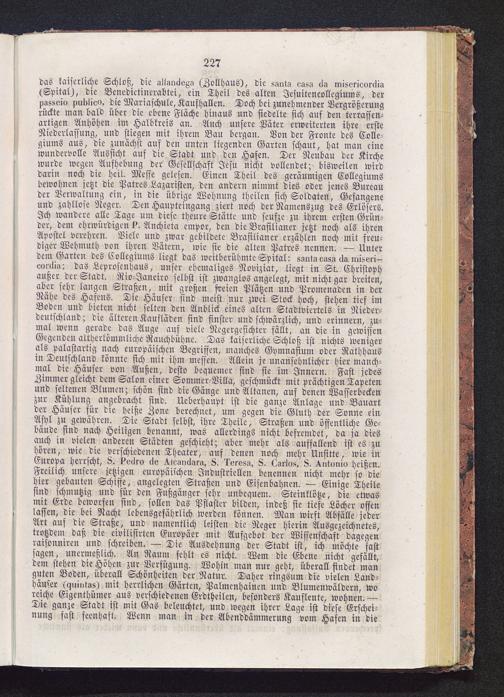 das kaiserliche Schloß, die allmiciogg (Zollhaus), die «snta ca-m 6a misoncorclia(Spital), die Benedictinerabtei, ein Theil des alten Jesuitencollegiums, derpgssoio pulilioo, die Mariaschule, Kaufhallen. Doch bei zunehmender Vergrößerungrückte man bald über die ebene Fläche hinaus und siedelte sich auf den terrassen-artigen Anhöhen im Halbkreis an. Auch unsere Kater erweiterten ihre ersteNiederlassung, und stiegen mit ihrem Bau bergan. Von der Fronte des Kolle-giums aus, die zunächst auf den unten liegenden Garten schaut, hat man einewundervolle Aussicht auf die Stadt und den Hafen. Der Neubau der Kirchewurde wegen Aufhebung der Gesellschaft Jesu nicht vollendet; bisweilen wirddarin noch die heil. Messe gelesen. Einen Theil des geräumigen Kollegiumsbewohnen jetzt die Patres Lazaristen , den andern nimmt dies oder jenes Bureauder Verwaltung ein, in die übrige Wohnung theilen sich Soldaten, Gefangeneund zahllose Neger. Den Haupteingang ziert noch der Namenszug des Erlösers.Ich wandere alle Tage um diese theure Stätte und seufze zu ihrem ersten Grün-der, dem ehrwürdigen l'. Anchieta empor, den die Brasilianer jetzt noch als ihrenApostel verehren. Viele und zwar gebildete Brasilianer erzählen noch mit freu-diger Wehmuth von ihren Vätern, wie sie die alten Patres nennen. — Unterdem Garten des Kollegiums liegt das weitberühmte Spital: 8anta easa 6a miski-i-eui6ia; das Leproscnhaus, uuser ehemaliges Noviziat, liegt in St. Christophaußer der Stadt. Rio-Janeiro selbst ist zwanglos angelegt, mit nicht gar breiten,aber sehr langen Straßen, mit großen freien Plätzen und Promenaden in derNähe des Hafens. Die Häuser sind meist Nur zwei Stock hoch, stehen tief imBoden und bieten nicht selten den Anblick eines alten Stadtviertels in Nieder-dentschland; die älteren Kaufläden sind finster und schwärzlich, und erinnern, zu-mal wenn gerade das Auge auf viele Negergesichter fällt, an die in gewissenGegenden altherkömmliche Rauchbühne. Das kaiserliche Schloß ist nichts wenigerals palastartig nach europäischen Begriffen, manches Gymnasium oder Rathhausin Deutschland könnte sich mit ihm messen. Allein je unansehnlicher hier manch-mal die Häuser von Außen, desto bequemer sind sie im Innern. Fast jedesZimmer gleicht dem Salon einer Sommer-Villa, geschmückt mit prächtigen Tapetenund seltenen Blumen; schön sind die Gänge und Altanen, auf denen Wasserbeckenzur Kühlung angebracht sind. Ueberhaupt ist die ganze Anlage und Bauartder Häuser für die heiße Zone berechnet, um gegen die Gluth der Sonne einAsyl zu gewähren. Die Stadt selbst, ihre Theile, Straßen und öffentliche Ge-bäude sind nach Heiligen benannt, was allerdings nicht befremdet, da ja diesauch in vielen anderen Städten geschieht; aber mehr als auffallend ist es zuhören, wie die verschiedenen Theater, auf denen noch mehr Unsitte, wie inEuropa herrscht, 8. ?o6rv 6a ^icanelara, 8. "lore-ai, 8. OrIci8, 8. Antonio heißen.Freilich unsere jetzigen europäischen Industriellen benennen nicht mehr so diehier gebauten Schiffe, angelegten Straßen und Eisenbahnen. — Einige Theilesind schmutzig und für den Fußgänger sehr unbequem. Steinklötze, die etwasmit Erde beworfen sind, sollen das Pflaster bilden, indeß sie tiefe Löcher offenlassen, die bei Nacht lebensgefährlich werden können. Man wirft Abfälle jederArt aus die Straße, und namentlich leisten die Neger hierin Ausgezeichnetes,trotzdem daß die civilisirten Europäer mit Aufgebot der Wissenschaft dagegenraisonniren und schreiben. — Die Ausdehnung der Stadt ist, ich möchte fastsagen, unermeßlich. An Raum fehlt es nicht. Wem die Ebene nicht gefällt,dem stehen die.Götzen zur Verfügung. Wohin man nur geht, überall findet manguten Boden, überall Schönheiten der Natur. Daher ringsum die vielen Land-häuser (qui»li>8) mit herrlicheu Gärten, Palmenhainen und Blumenwäldern, woreiche Eigenthümer aus verschiedenen Erdtheilen, besonders Kaufleute, wohnen. —Die ganze Stadt ist mit Gas beleuchtet, und wegen ihrer Lage ist diese Erschei-nung fast feenhaft. Wenn man in der Abenddämmerung vom Hasen in die