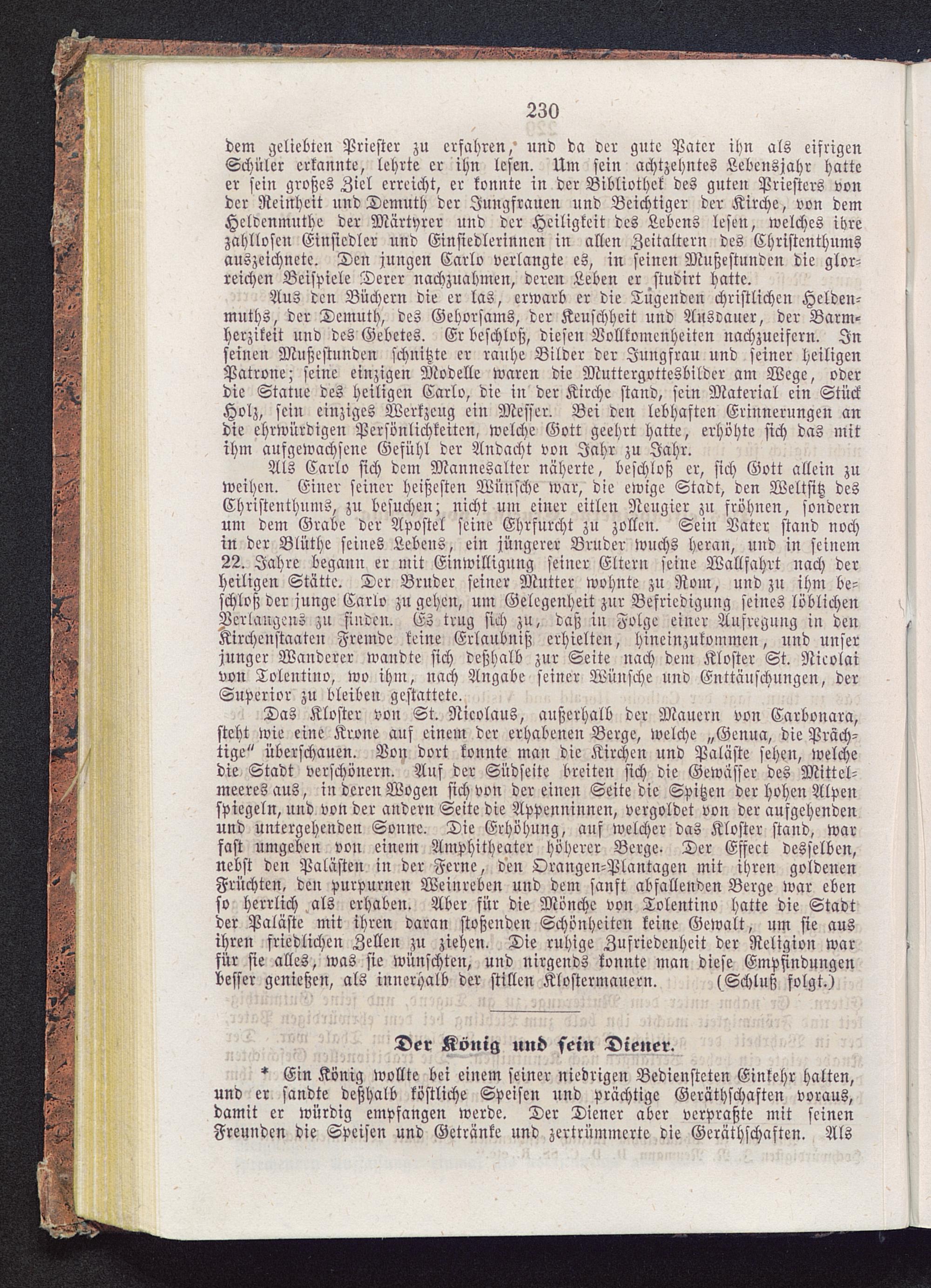 dem geliebten Priester zu erfahren, und da der gute Pater ihn als eifrigenSchüler erkannte, lehrte er ihn lesen. Um sein achtzehntes Lebensjahr hatteer sein großes Ziel erreicht, er konnte in der Bibliothek des guten Priesters vonder Reinheit und Demuth der Jungfrauen und Beichtiger der Kirche, von demHeldenmnthe der Märtyrer und der Heiligkeit des Lebens lesen, welches ihrezahllosen Einsiedler und Einsiedlerinnen in allen Zeitaltern des Christenthumsauszeichnete. Den jungen Carlo verlangte es, in seinen Mußestunden die glor-reichen Beispiele Derer nachzuahmen, deren Leben er studirt hatte.