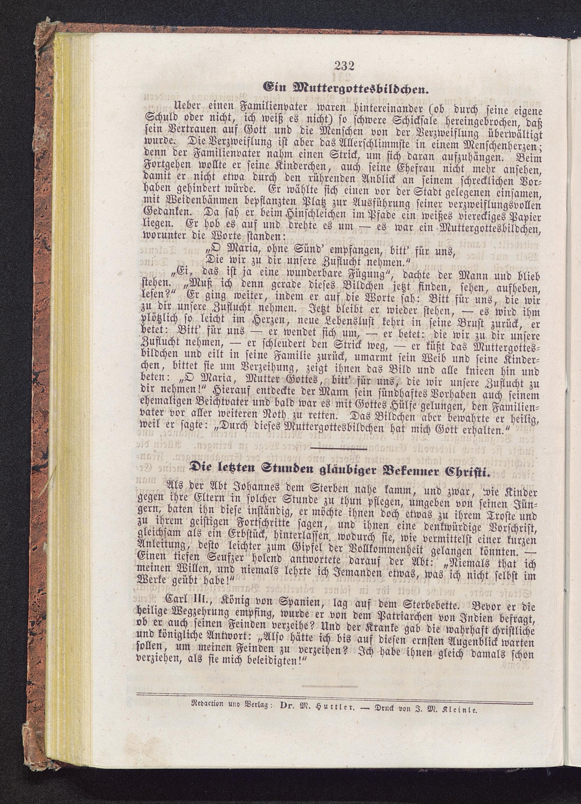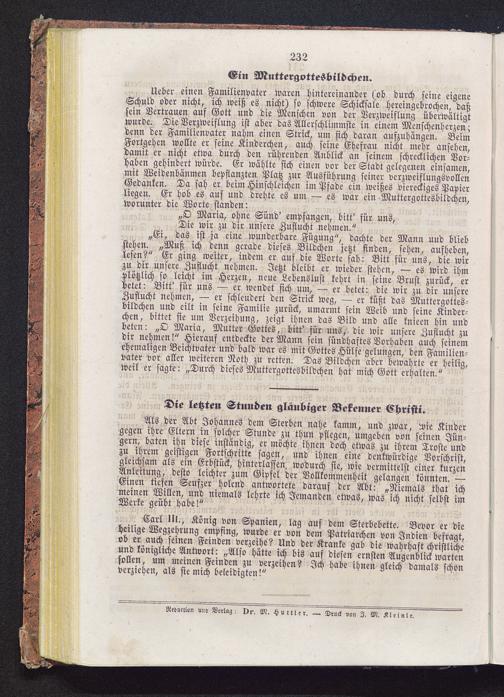 Ueber einen Familienvater waren hintereinander (ob durch seine eigeneSchuld oder nicht, ich weiß es nicht) so schwere Schicksale hereingebrochen, daßsein Vertrauen auf Gott und die Menschen von der Verzweiflung überwältigtwurde. Die Verzweiflung ist aber das Allerschlimmste in einem Menschenherzen;denn der Familienvater nahm einen Strick, um sich daran aufzuhängen. BeimFortgehen wollte er seine Kinderchen, auch seine Ehefrau nicht mehr ansehen,damit er nicht etwa durch den rührenden Anblick an seinem schrecklichen Vor-haben gehindert würde. Er wählte sich einen vor der Stadt gelegenen einsamen,mit Weidenbänmen bepflanzten Platz zur Ausführung seiner verzweiflungsvollenGedanken. Da sah er beim Hinschleichen im Pfade ein weißes viereckiges Papierliegen. Er hob es auf und drehte es um — es war ein Muttergottesbildchen,worunter die Worte standen: