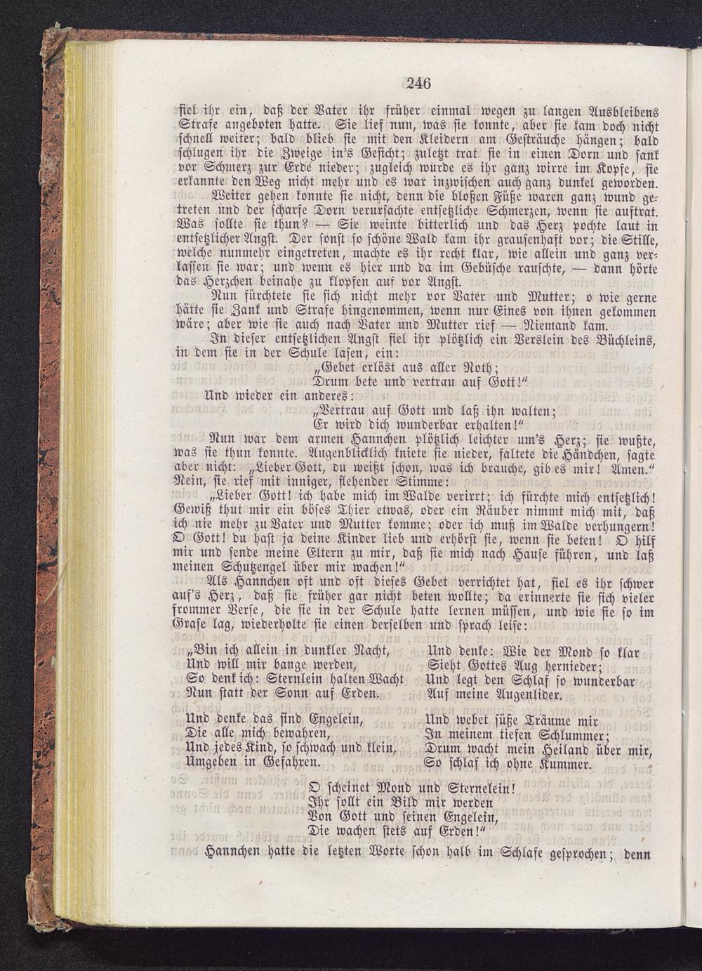 „Lieber Gott ! ich habe mich im Walde verirrt; ich fürchte mich entsetzlich!Gewiß thut mir ein böses Thier etwas, oder ein Räuber nimmt mich mit, daßich nie mehr zu Vater und Mutter komme; oder ich muß im Walde verhungern!O Gott! du hast ja deine Kinder lieb und erhörst sie, wenn sie beten! O hilfmir und sende meine Eltern zu mir, daß sie mich nach Hause führen, und laßmeinen Schutzengel über mir wachen!"