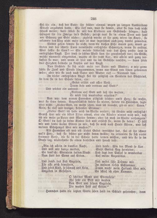 Als Hannchen oft und oft dieses Gebet verrichtet hat, fiel es ihr schwerauf's Herz, daß sie früher gar nicht beten wollte; da erinnerte sie sich vielerfrommer Verse, die sie in der Schule hatte lernen müssen, und wie sie so imGrase lag, wiederholte sie einen derselben und sprach leise: