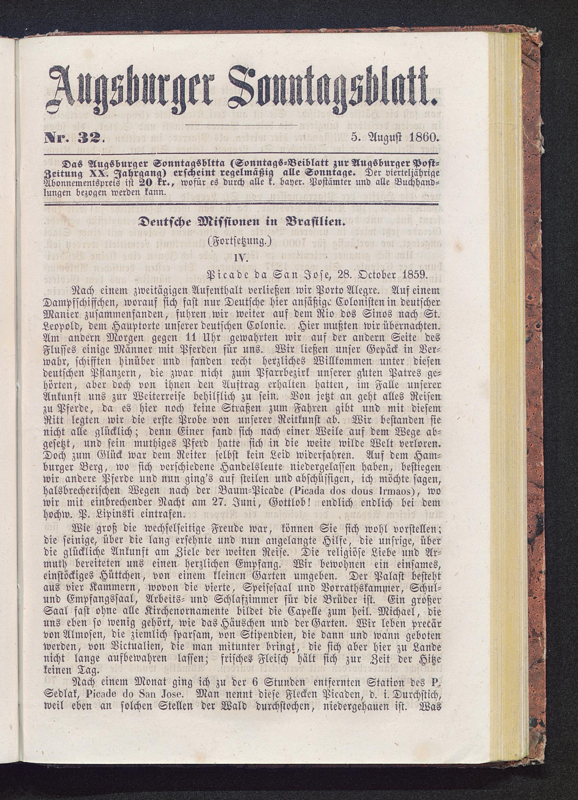 Nach einem zweitägigen Aufenthalt verließen wir Porto Alegre. Aus einemDampfschiffchen, woraus sich fast nur Deutsche hier ansäßigo Colonisteuin deutscherManier zusammenfanden, fuhren wir weiter auf dem Rio dos Sinos nach St.Leopold, dem Hauptorte unserer deutschen Colonie. Hier mußten wir übernachten.Am andern Morgen gegen 11 Uhr gewahrten wir auf der andern Seite desFlusses einige Männer mit Pferden für uns. Wir ließen unser Gepäck in Ver-wahr, schifften hinüber und fanden recht herzliches Willkommen unter diesendeutschen Pflanzern, die zwar nicht zum Pfarrbezirk unserer güten Patres ge-hörten, aber doch von ihnen den Auftrag erhalten hatten, im Falle unsererAnkunft uns zur Weiterreise behilflich zu sein. Von jetzt an geht alles Reisenzu Pferde, da es hier noch keine Straßen zum Fahren gibt und mit diesemRitt legten wir die erste Probe von unserer Reitkunst ab. Wir bestanden sienicht alle glücklich; denn Einer fand sich nach einer Weile auf dem Wege ab-gesetzt, und sein muthiges Pferd hatte sich in die weite wilde Welt verloren.Doch zum Glück war dem Reiter selbst kein Leid widerfahren. Auf dem Ham-burger Berg, wo sich verschiedene Handelsleute niedergelassen haben, bestiegenwir andere Pferde und nun ging's auf steilen und abschüssigen, ich möchte sagen,halsbrecherischen Wegen nach der Baum-Picade (Illo-uw «tos cious Irmaos), wowir mit einbrechender Nacht am 27. Juni, Gottlob! endlich endlich bei demhochw. P. Lipinski eintrafen.