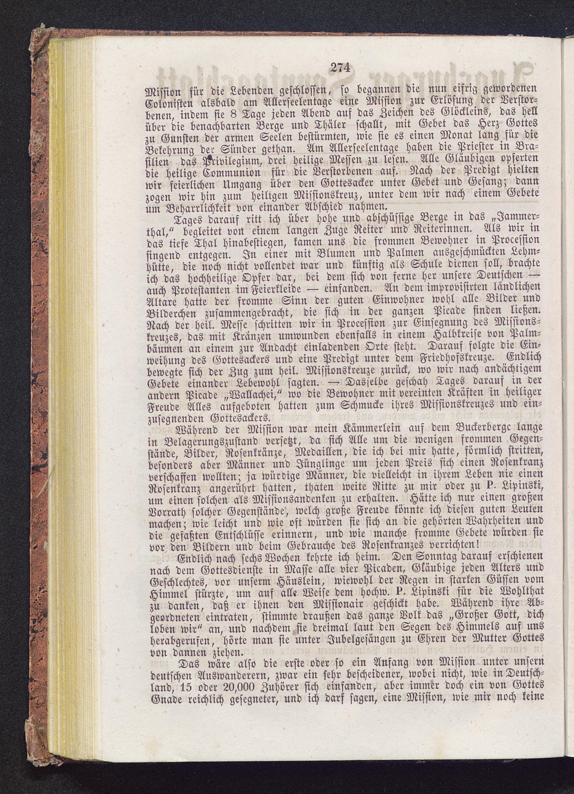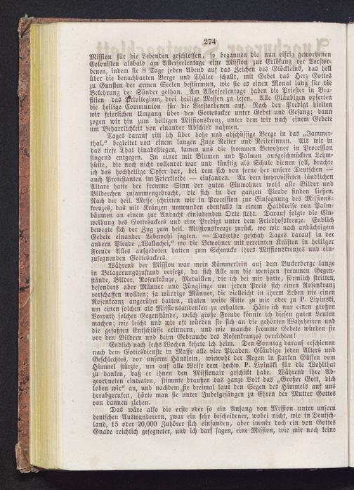 Mission für die Lebenden geschlossen, so begannen die nun eifrig gewordenenColonisten alsbald am Allerseelentage eine Mission zur Erlösung der Verstor-benen, indem sie 8 Tage jeden Abend auf das Zeichen des Glöckleins, das hellüber die benachbarten Berge und Thäler schallt, mit Gebet das Herz Gotteszu Gunsten der armen Seelen bestürmten, wie sie es einen Monat lang für dieBekehrung der Sünder gethan. Am Allerseelentage haben die Priester in Bra-silien das Privilegium, drei heilige Messen zu lesen. Alle Gläubigen opfertendie heilige Communion für die Verstorbenen auf. Nach der Predigt hieltenwir feierlichen Umgang über den Gottesacker unter Gebet und Gesang; dannzogen wir hin zum heiligen Missionskreuz, unter dem wir nach einem Gebeteum Beharrlichkeit von einander Abschied nahmen.