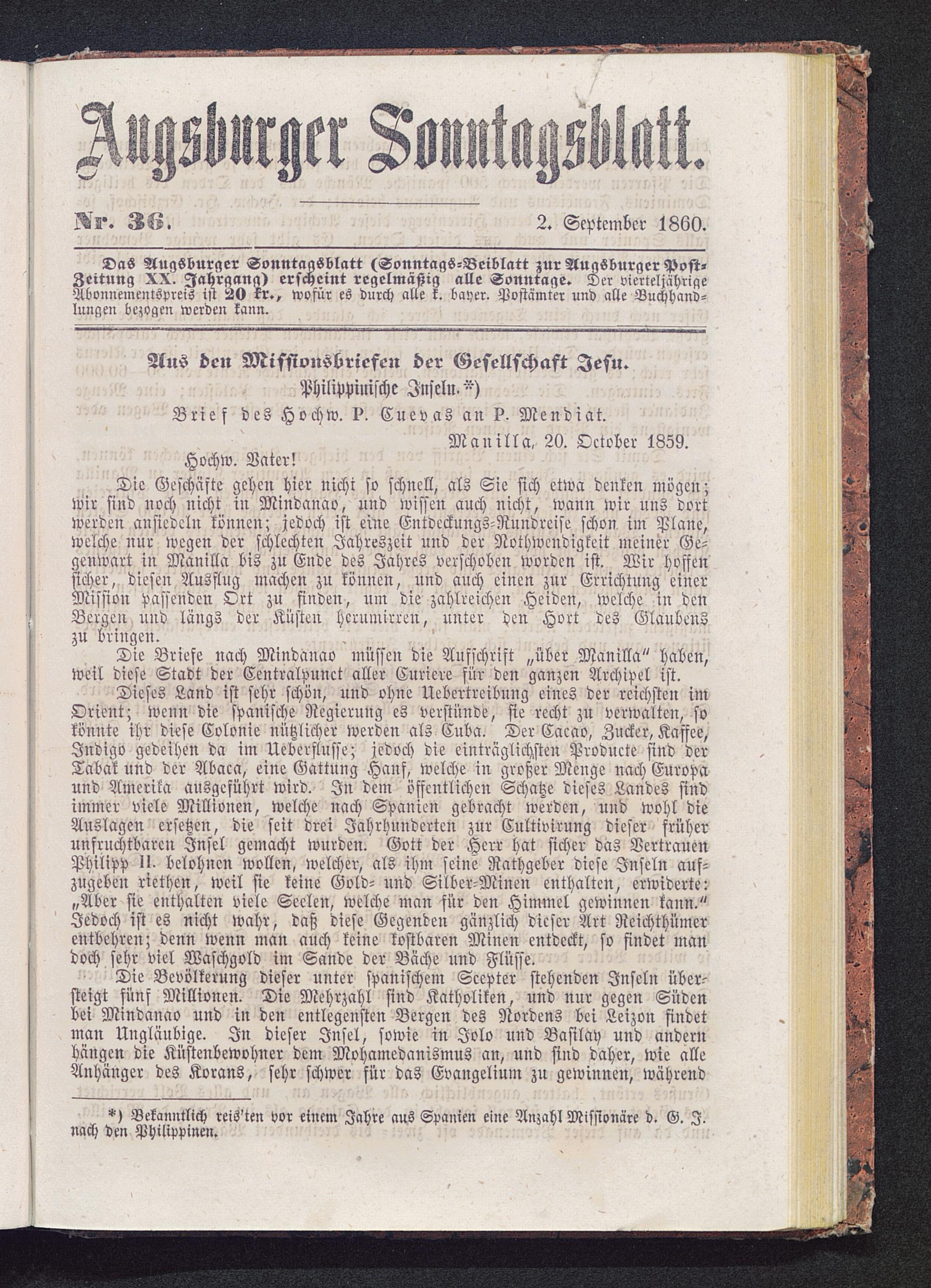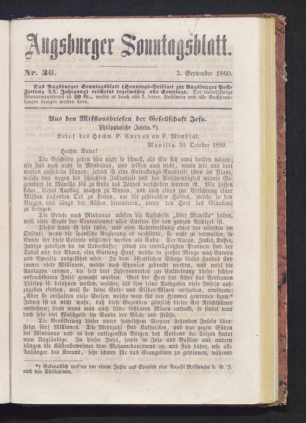 Das Augsburger Sonntagsblatt (Sonntags-Beiblatt zur Augsburger Post»Zeitung XX. Jahrgang) erscheint regelmäßig alle Sonntage. Der vierteljährigeAbonnementspreis ist 20 kr.» wofür es durch alle k. bayer. Postämter und alle Buchhand-lungen bezogen werden kann.
