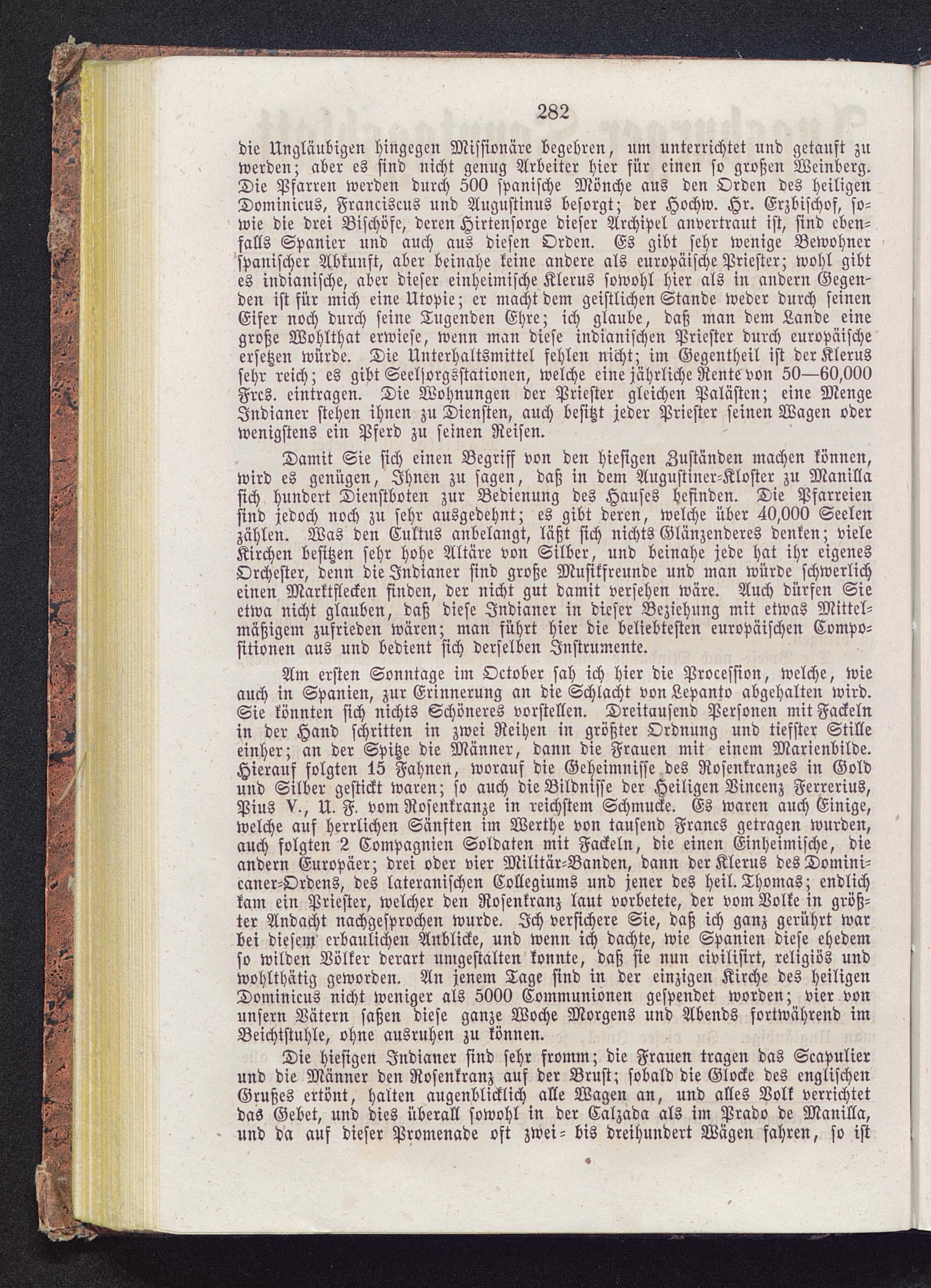 Am ersten Sonntage im October sah ich hier die Procession, welche, wieauch in Spanien , zur Erinnerung an die Schlacht von Lepanto abgehalten wird.Sie könnten sich nichts Schöneres vorstellen. Dreitausend Personen mit Fackelnin der Hand schritten in zwei Reihen in größter Ordnung und tiefster Stilleeinher; an der Spitze die Männer, dann die Frauen mit einem Marienbilde.Hierauf folgten 15 Fahnen, worauf die Geheimnisse des Rosenkranzes in Goldund Silber gestickt waren; so auch die Bildnisse der Heiligen Vincenz Ferrerius,Pins V., U. F vom Rosenkränze in reichstem Schmucke. Es waren auch Einige,welche auf herrlichen Sänften im Werthe von tausend Francs getragen wurden,auch folgten 2 Compagnien Soldaten mit Fackeln, die einen Einheimische, dieandern Europäer; drei oder vier Militär-Banden, dann der Klerus des Domini-caner-Ordens, des lateranischen Collegiums und jener des heil. Thomas; endlichkam ein Priester, welcher den Rosenkranz laut vorbetete, der vom Volke in größ-ter Andacht nachgesprochen wurde. Ich versichere Sie, daß ich ganz gerührt warbei diesem' erbaulichen Anblicke, und wenn ich dachte, wie Spanien diese ehedemso wilden Völker derart umgestalten konnte, daß sie nun civilisirt, religiös undwohlthätig geworden. An jenem Tage sind in der einzigen Kirche des heiligenDominicus nicht weniger als 5000 Communionen gespendet worden; vier vonunsern Vätern saßen diese ganze Woche Morgens und Abends fortwährend imBeichtstühle, ohne ausruhen zu können.