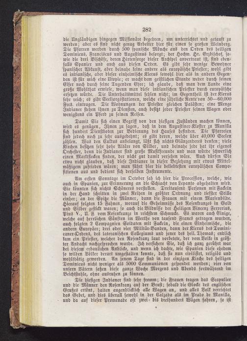 die Ungläubigen hingegen Missionäre begehren, um unterrichtet und getauft zuwerden; aber es sind nicht genug Arbeiter hier für einen so großen Weinberg.Die Pfarren werden durch 500 spanische Mönche aus den Orden des heiligenDominicus, Franciscus und Augustinus besorgt; der Hochw. Hr. Erzbischof, so-wie die drei Bischöfe, deren Hirtensorge dieser Archipel anvertraut ist, sind eben-falls Spanier und auch aus diesen Orden. Es gibt sehr wenige Bewohnerspanischer Abkunft, aber beinahe keine andere als europäische Priester; wohl gibtes indianische, aber dieser einheimische Klerus sowohl hier als in andern Gegen-den ist für mich eine Utopie; er macht dem geistlichen Stande weder durch seinenEifer noch durch seine Tugenden Ehre; ich glaube, daß man dem Lande einegroße Wohlthat erwiese, wenn man diese indianischen Priester durch europäischeersetzen würde. Die Unterhaltsmittel fehlen nicht; im Gegentheil ist der Klerussehr reich; es gibt Seelsorgsstationen, welche eine jährliche Rente von 50—60,000Frcs. eintragen. Die Wohnungen der Priester gleichen Palästen; eine MengeIndianer stehen ihnen zu Diensten, auch besitzt jeder Priester seinen Wagen oderwenigstens ein Pferd zu seinen Reisen.