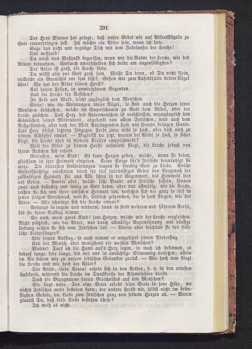 Siehe! wie die Wohnungen dieser Vogel, so sind auch die Herzen jenerMenschen beschaffen, welche im Emporschauen zu Gott dem Adler, oder derLerche gleichen. Das Herz des Adlermenschen ist verschlossen, unzugänglich denSchwächen seines Mitbruders, abgelenkt von allem Irdischen, was auch demBestgesinnten, aber doch der Welt Anhängenden Leid und Freude bringen könnte.Das Herz dieses letztern hingegen strebt zwar nicht so hoch, aber doch auch zuseinem Schöpfer empor. — Begreifst du jetzt, warum der Adler so hoch, so sicherfliegt, die Lerche aber in niedern Kreisen emporschwebt?
