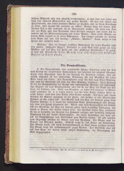 6. Die Compaßblume, eine neuentdeckte Pflanze Amerikas , neigt sich stetsnach Norden bei freundlichem Sonnenschein, wie während des tosenden Sturmes.Durch diese Eigenschaft kann sie den Compaß bei Seereisen ersetzen, aber un-endlich nützlicher ist ihre symbolische Bedeutung für den Menschen bei seinerReise durch das Leben. Die Compaßblume neigt sich stets nach Einer Richtung,und auch der Sterbliche soll stets nur Eine Richtung verfolgen. Diese Richtungist bei der Compaßblume der strenge und unfreundliche Norden, die mitternäch-tige Gegend; bei dem Staubgebornen aber soll sie der Weg, die Nacht des Lei-dens, der Trübsale sein. Wohl dem Menschen, an dessen Erdenhimmel es Mitter-nacht geworden ist, d. h. dessen Leiden den für seine Kräfte höchsten Grad er-reicht haben! denn über seine Kräfte wird Keiner versucht. Der Herr gibt einemSolchen die Gewalt gleichsam in die Hand, mit welcher er den überirdischenHimmel an sich reißen soll. Der Mensch muß den Weg des Leidens gehen beimtosenden Sturme, d. h. wenn der himmlische Vater Heimsuchungen und Drang-sale über sein Haupt gesammelt hat. Allein auch beim Sonnenschein des Glückessoll der Sterbliche den Weg des Leidens gehen durch freiwillige Entsagung, undindem er Andere ihre Leiden tragen hilft, wie Christus diesen Weg gewandeltist, da er freiwillig den Freuden des Himmels entsagte und freiwillig unsäglicheSchmerzen litt für fremde Sündenschuld. In diesen Deutungen also kann undsoll die Compaßblume dem Sterblichen zum Vorbild dienen. Es gibt indessenauch Gegensätze zwischen der Blume und dem Menschen. Die Blume muß derGewalt des Sturmes weichen. Geknickt neigt sie das Haupt zur Verdorrung.Der Mensch jedoch soll durch Lebensprüfungen zu Gott empor gerichtet werden.Die Blume neigt sich bestimmungslos gegen Norden. Der Sterbliche aber sollauf dem Wege der Leiden seiner ewigen Bestimmung: der Vereinigung mitGott entgegengehen.