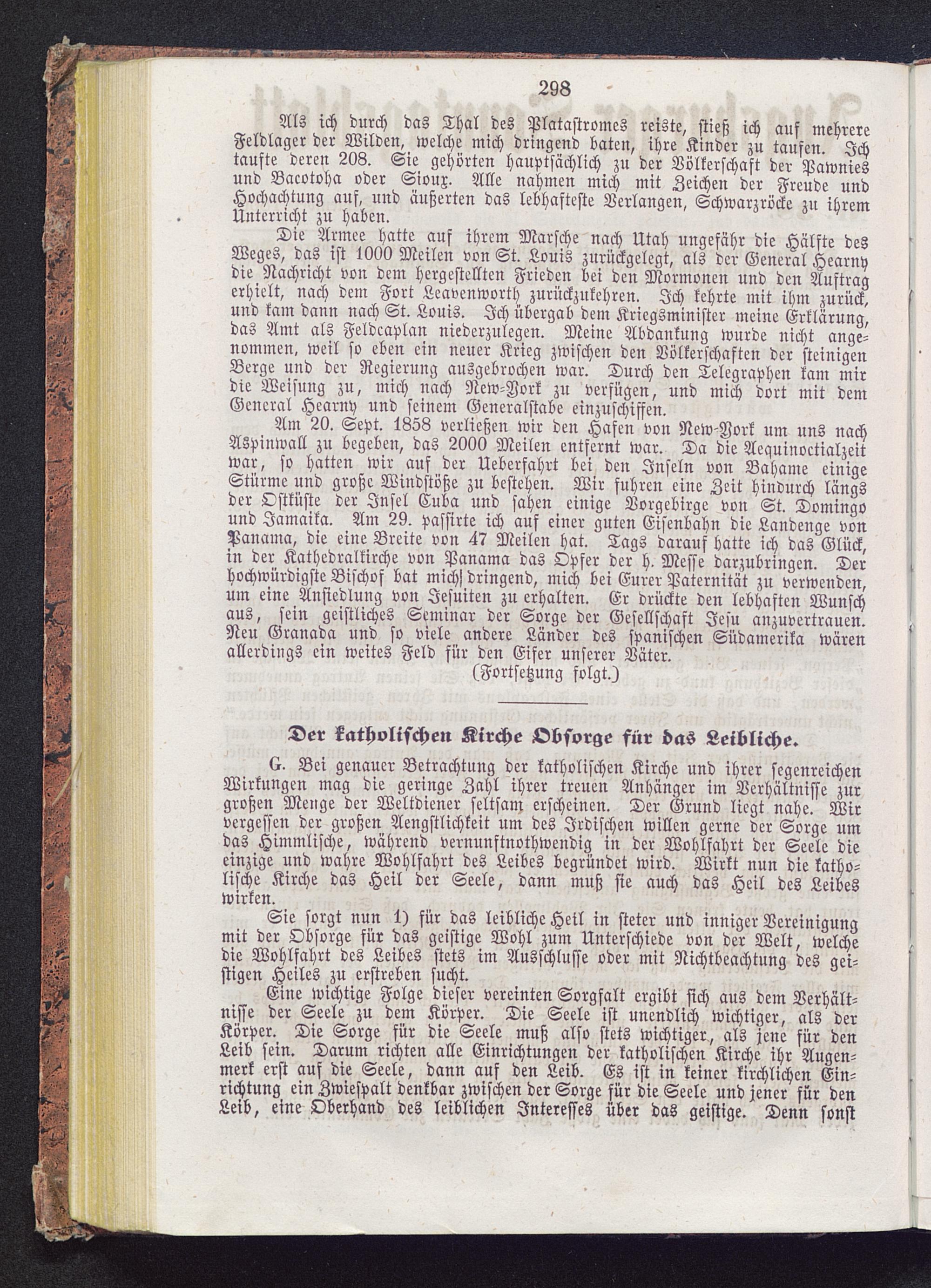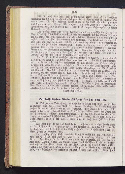 Am 20. Sept. 1858 verließen wir den Hafen von New-Uork um uns nachAsPinwall zu begeben, das 2000 Meilen entfernt war. Da die Aequinoctialzeitwar, so hatten wir auf der Ueberfahrt bei den Inseln von Bahame einigeStürme und große Windstöße zu bestehen. Wir fuhren eine Zeit hindurch längsder Ostküste der Insel Cuba und sahen einige Vorgebirge von St. Domingound Jamaika . Am 29. passirte ich aus einer guten Eisenbahn die Landenge vonPanama , die eine Breite von 47 Meilen hat. Tags darauf hatte ich das Glück,in der Kathedralkirche von Panama das Opfer der h. Messe darzubringen. Derhochwürdigste Bischof bat michs dringend, mich bei Eurer Paternität zu verwenden,um eine Ansiedlung von Jesuiten zu erhalten. Er drückte den lebhaften Wunschaus, sein geistliches Seminar der Sorge der Gesellschaft Jesu anzuvertrauen.Neu Granada und so viele andere Länder des spanischen Südamerika wärenallerdings ein weites Feld für den Eifer unserer Väter.