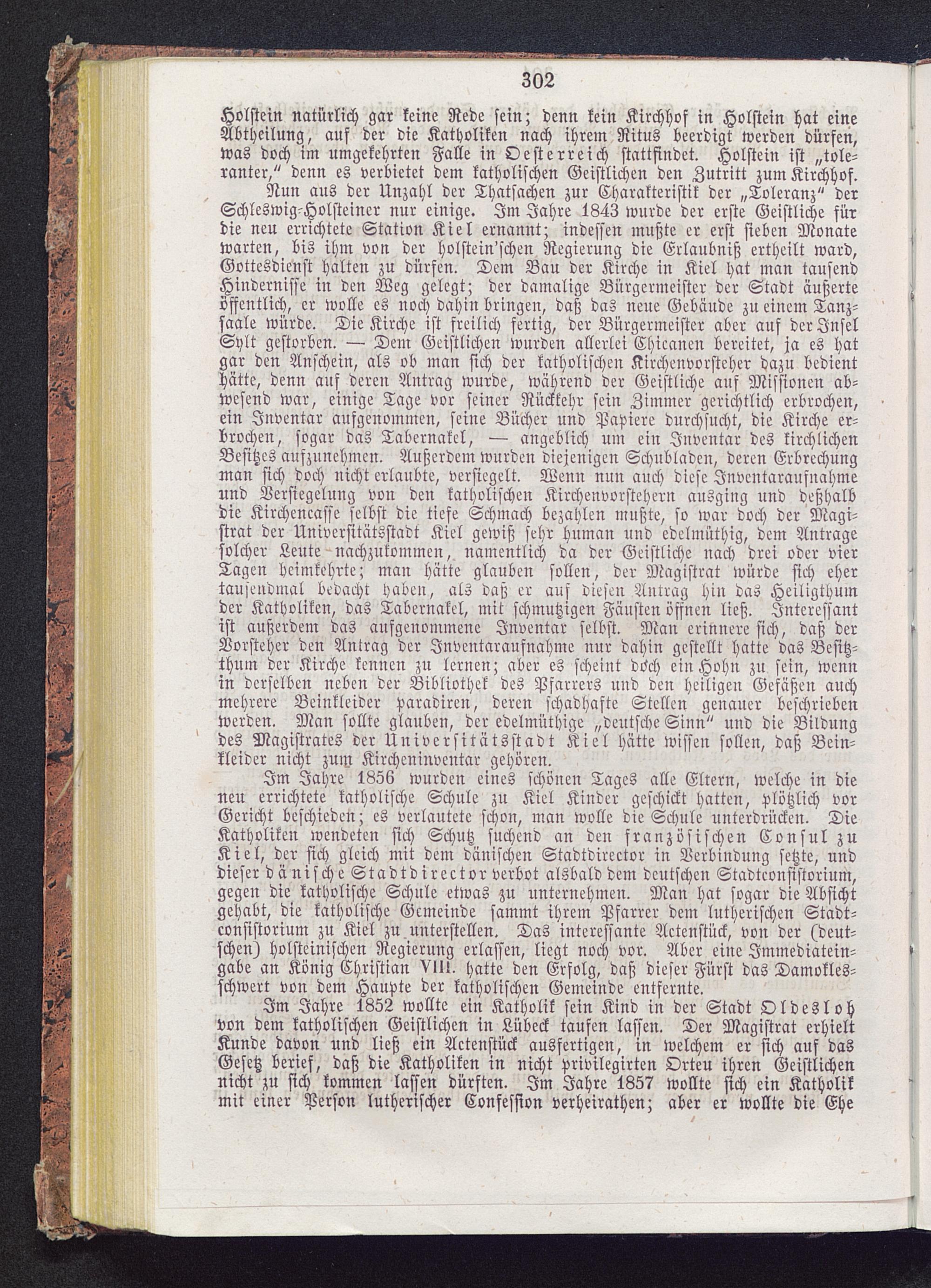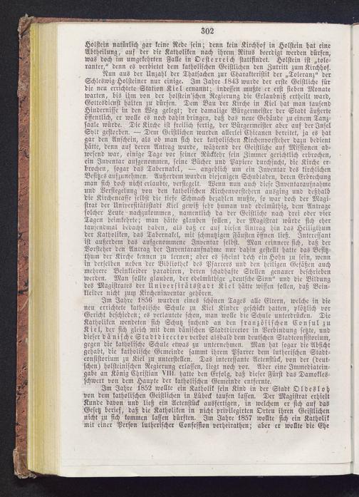 Nun aus der Unzahl der Thatsachen zur Charakteristik der „Toleranz" derSchleswig-Holsteiner nur einige. Im Jahre 18^i3 wurde der erste Geistliche fürdie neu errichtete Station Kiel ernannt; indessen mußte er erst sieben Monatewarten, bis ihm von der holstein 'schen Regierung die Erlaubniß ertheilt ward,Gottesdienst halten zu dürfen. Dem Bau der Kirche in Kiel hat man tausendHindernisse in den Weg gelegt; der damalige Bürgermeister der Stadt äußerteöffentlich, er wolle es noch dahin bringen, daß das neue Gebäude zu einem Tanz-saale würde. Die Kirche ist freilich fertig, der Bürgermeister aber auf der InselSylt gestorben. — Dem Geistlichen wurden allerlei Chicanen bereitet, ja es hatgar den Anschein, als ob man sieh der katholischen Kirchenvorsteher dazu bedienthätte, denn auf deren Antrag wurde, während der Geistliche auf Missionen ab-wesend war, einige Tage vor seiner Rückkehr sein Zimmer gerichtlich erbrochen,ein Inventar aufgenommen, seine Bücher und Papiere durchsucht, die Kirche er-brochen, sogar das Tabernakel, — angeblich um ein Inventar des kirchlichenBesitzes aufzunehmen. Außerdem wurden diejenigen Schubladen, deren Erbrechungman sich doch nicht erlaubte, versiegelt. Wenn nun auch diese Inventaraufnahmeund Versiegelung von den katholischen Kirchenvorstehern ausging und deßhalbdie Kirchencasse selbst die tiefe Schmach bezahlen mußte, so war doch der Magi-strat der Universitätsstadt Kiel gewiß sehr human und edelmüthig, dem Antragesolcher Leute nachzukommen,, namentlich da der Geistliche nach drei oder vierTagen heimkehrte; man hätte glauben sollen, der Magistrat würde sich ehertausendmal bedache haben, als daß er auf diesen Antrag hin das Heiligthumder Katholiken, das Tabernakel, mit schmutzigen Fäusten öffnen ließ. Interessantist außerdem das aufgenommene Inventar selbst. Man erinnere sich, daß derVorsteher den Antrag der Inventaraufnahme nur dahin gestellt hatte das Besitz-thum der Kirche kennen zu lernen; aber es scheint döch ein Hohn zu sein, wennin derselben neben der Bibliothek des Pfarrers und den heiligen Gefäßen auchmehrere Beinkleider paradircn, deren schadhafte Stellen genauer beschriebenwerden. Man sollte glauben, der edelmüthige „deutsche Sinn" und die Bildungdes Magistrates der Universitätsstadt Kiel hätte wissen sollen, daß Bein-kleider nicht zuipr Kircheninvcntar gehören.