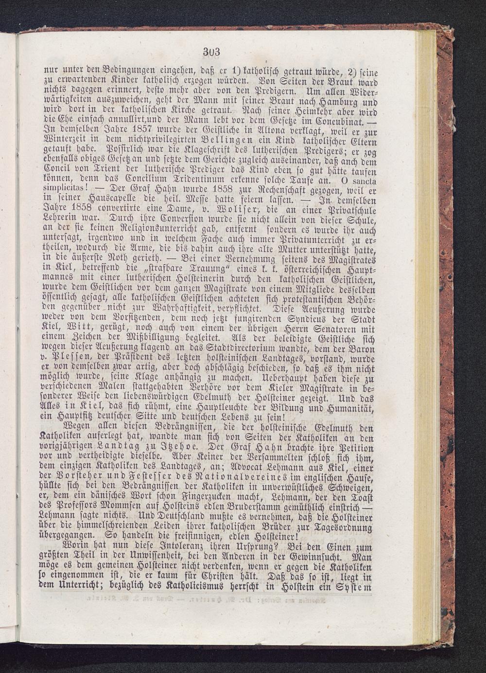 Worin hat nun diese Intoleranz ihren Ursprung? Bei den Einen zumgrößten Theil in der Unwissenheit, bei den Anderen in der Gewinnsucht. Manmöge es dem gemeinen Holsteiner nicht verdenken, wenn er gegen die Katholikenso eingenommen ist, die er kaum für Christen hält. Daß das so ist, liegt indem Unterricht; bezüglich des Katholicismus herrscht in Holstein ein System