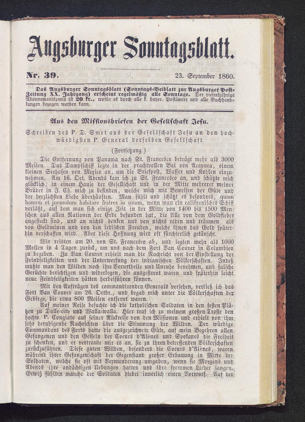 Das Augsburger Sonntagsblatt (Sonntags-Beiblatt zur Nugsburget Post-Zeitung XX. Jahrgang) erscheint regelmäßig alle Sonntage. Der vierteljährigeAbonnementspreis ist 20 kr., wofür es durch alle k. bayer. Postämter und alle Buchhand-lungen bezogen werden kann.