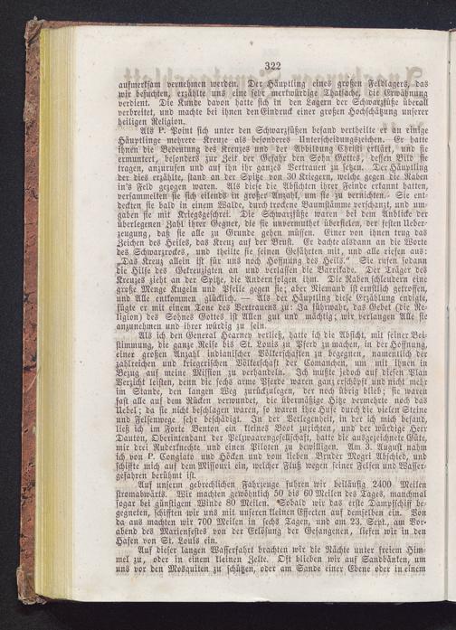 Als ich den General Hearney verließ, hatte ich die Absicht, mit seiner Bei-stimmung, die ganze Reise bis St. Louis zu Pferd zu machen, in der Hoffnung,einer großen Anzahl indianischer Völkerschaften zu begegnen, namentlich derzahlreichen und kriegerischen Völkerschaft der Comanchen, um mit ihnen inBezug auf meine Mission zu verhandeln. Ich mußte jedoch auf diesen PlanVerzicht leisten, denn die sechs arme Pferde waren ganz erschöpft und nicht mehrim Stande, den langen Weg zurückzulegen, der noch übrig blieb; sie warenfast alle auf dem Rücken verwundet, die übermäßige Hitze vermehrte noch dasUebel; da sie nicht beschlagen waren, so waren ihre Hufe durch die vielen Steineund Felsenwege sehr beschädigt. In der Verlegenheit, in der ich mich befand,ließ ich im Forte Benton ein kleines Boot zurichten, und der würdige HerrDanton , Oberintendant der Pelzwaarengesellschaft, hatte die ausgezeichnete Güte,mir drei Ruderknechte und einen Piloten zu bewilligen. Am 3. August nahmich von U Congiato und Höcken und vom lieben Bruder Mogri Abschied, undschiffte mich auf dem Missouri ein, welcher Fluß wegen seiner Felsen und Wasser-gefahren berühmt ist.