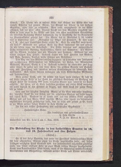Gott und der seligsten Jungfrau Maria sei die Ehre und unser demüthig-ster, innigster Dank für den Schutz und die erhaltenen Gnaden auf dieser langenund letzten Reise. Nachdem ich zu Lande und auf den Flüssen 8314 englischeMeilen und auf dem Meere 6950 englische Meilen ohne irgend ein bedeutendesunglückliches Ereigniß zurückgelegt hatte, kam ich frisch und gesund zu St. Louis in der Mitte meiner lieben Brüdcr in Jesu Christo an.