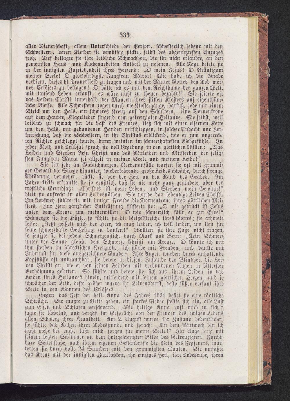 aller Dienerschaft, allem Unterschiede der Person, schwesterlich lebend mit denSchwestern, deren Kleider sie demüthig flickte, selbst des abgenütztesten Anzugesfroh. Tief beklagte sie ihre leibliche Schwachheit, die ihr nicht erlaubte, an dengemeinsten Haus - und Küchenarbeiten Antheil zu nehmen. Alle Tage betete siein der innigsten Zufriedenheit ihres Herzens: „O mein Jesus ! O Bräutigammeiner Seele! O glorwürdigste Jungfrau Maria! Wie habe ich die Gnadeverdient, dieses hl. Trauerkleid zu tragen und mit der Mutter Gottes den Tod mei-nes Erlösers zu beklagen! O hätte ich es mit dem Reichthume der ganzen Welt,mit tausend Leben erkauft, es wäre nicht zu theuer bezahlt!" Sie feierte oftdas Leiden Christi innerhalb der Mauern ihres stillen Klosters auf eigenthüm-liche Weise. Alle Schwestern zogen durch die Klostergänge, barfuß, jede mit einemStrick um den Hals, ein schweres Kreuz auf den Schultern, eine Dornenkroneaus dem Haupte, Klagelieder singend dem gekreuzigten Heilande. Sie selbst, weilleiblich zu schwach für die Last des Kreuzes, ließ sich mit einer eisernen Ketteum den Hals, mit gebundenen Händen mitschleppen, in solcher Andacht und Zer-knirschung, daß die Schwestern, in ihr Christus erblickend, wie er zum ungerech-ten Richter geschleppt wurde, bitter weinten im schmerzhaftesten Wehgesühle. Injeder Noth und Trübsal sprach sie voll Ergebung in den göttlichen Willen: „DasLeiden und Sterben Jesu Christi und das Mitleiden und Mitsterben der selig-sten Jungfrau Maria sei allzeit in meiner Seele und meinem Leibe!"