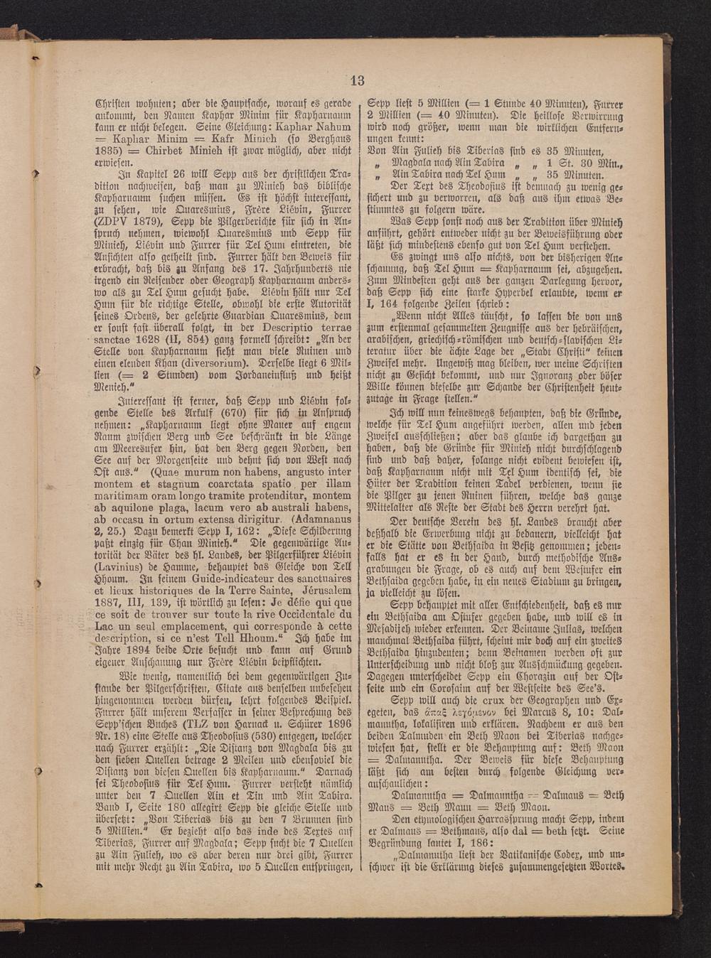 Wie wenig, namentlich bei dem gegenwärtigen Zu-stande der Pilgerschrifteu, Citate aus denselben unbesehenhingenommen werden dürfen, lehrt folgendes Beispiel.Furrer hält unserem Verfasser in seiner Besprechung desSepp'schen Buches (Ist,!? von Harnack u. Schürer 1896Nr. 18) eine Stelle aus Theodosius (530) entgegen, welchernach Furrer erzählt: „Die Distanz von Magdala bis zuden sieben Quellen betrage 2 Meilen und ebensoviel dieDistanz von diesen Quellen bis Kapharuaum." Darnachsei Theodosius für Tel Hum. Furrer versteht nämlichunter den 7 Quellen Am et Tin und Ain Tabira.Band I, Seite 180 allegirt Sepp die gleiche Stelle undübersetzt: „Von TibcriaS bis zu den 7 Brunnen sind5 Millien." Er bezieht also das inlls des Textes aufTiberias, Furrer auf Magdala ; Sepp sucht die 7 Quellenzu Ain Fulieh, wo es aber deren nur drei gibt, Furrermit mehr Recht zu Ain Tabira, wo 5 Quellen entspringen,